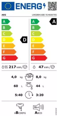 Cet appareil encastrable AEG LWG88416BI combine un lave‑linge 8 kg et un sèche‑linge 4 kg. Sa technologie PowerCare prémélange la lessive pour une efficacité accrue et la fonction vapeur réduit les plis. Avec une vitesse d’essorage de 1600 tr/min, il propose des programmes complets incluant la vapeur et un ajustement automatique de la consommation selon la charge. L’étiquette énergie est A en mode lavage et D en mode lavant séchant.