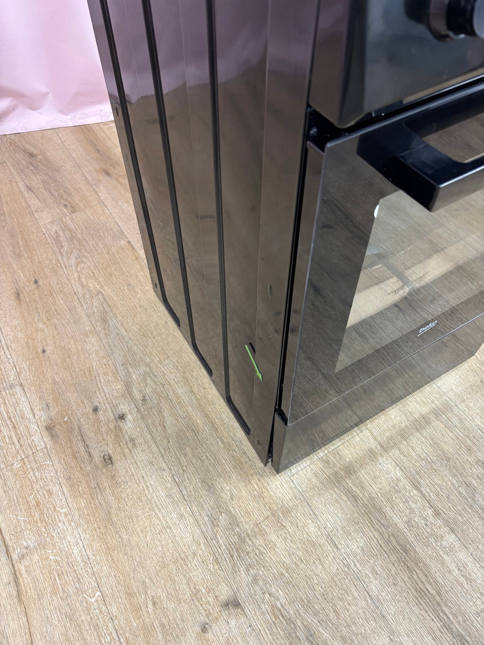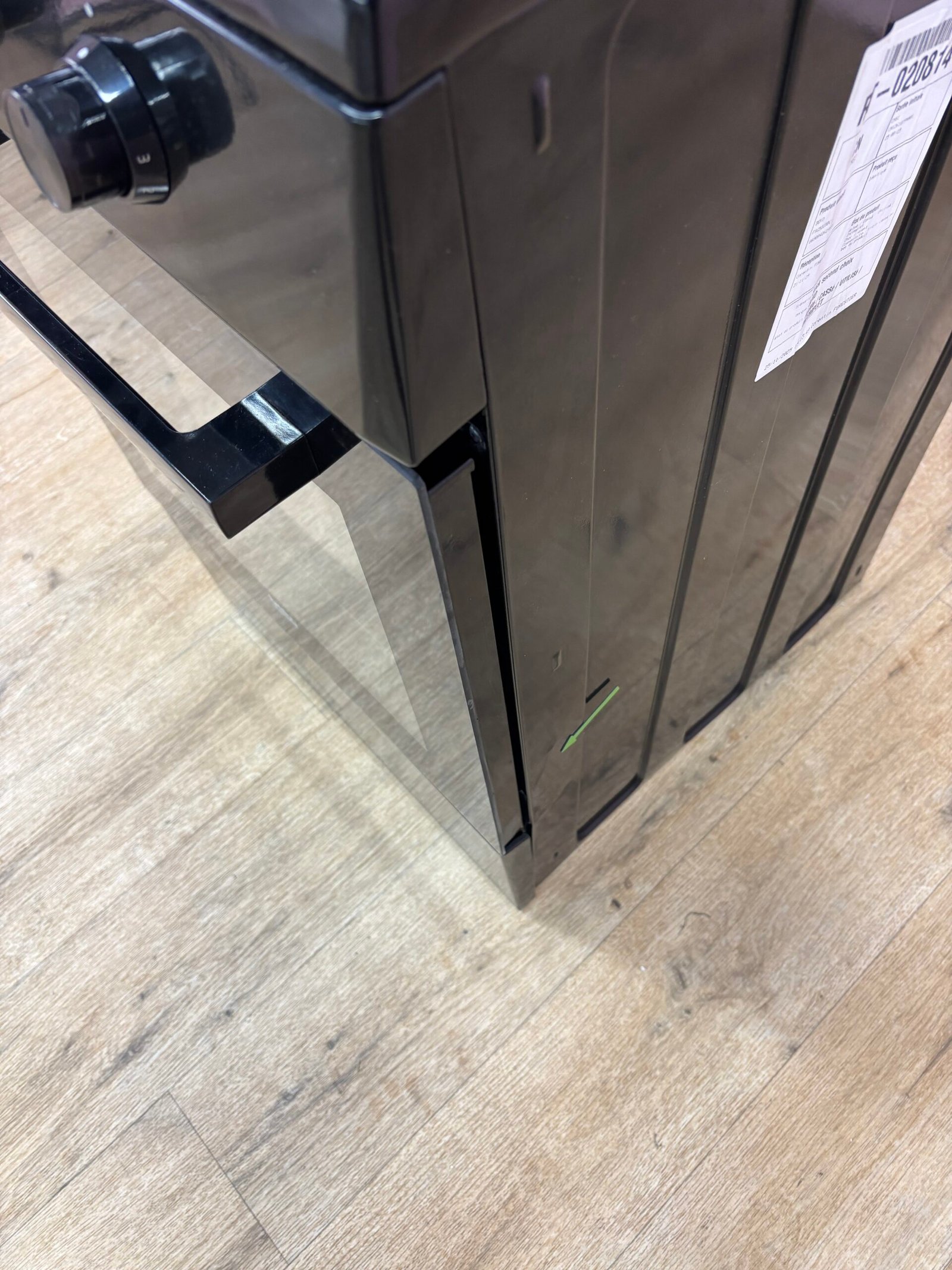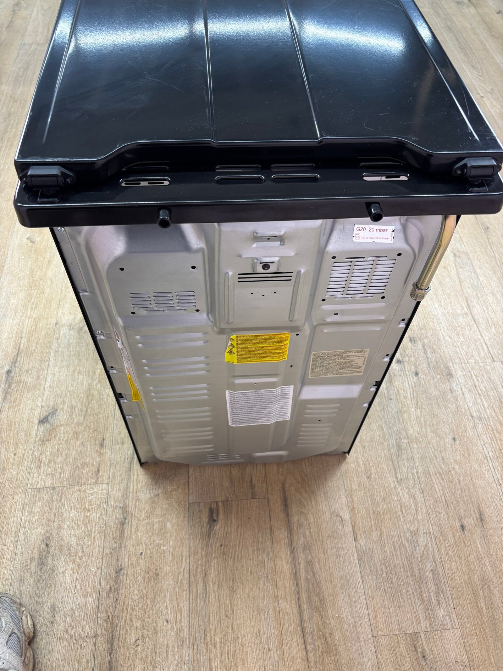 Les commandes mécaniques à boutons métalliques assurent une utilisation simple et intuitive. La porte du four en verre plein est plane, démontable et facile à nettoyer. Un couvercle en métal protège la table de cuisson et peut servir de crédence. La gazinière dispose d’un tiroir de rangement en partie basse, destiné au stockage des plats et accessoires, celui-ci étant endommagé sur ce produit.