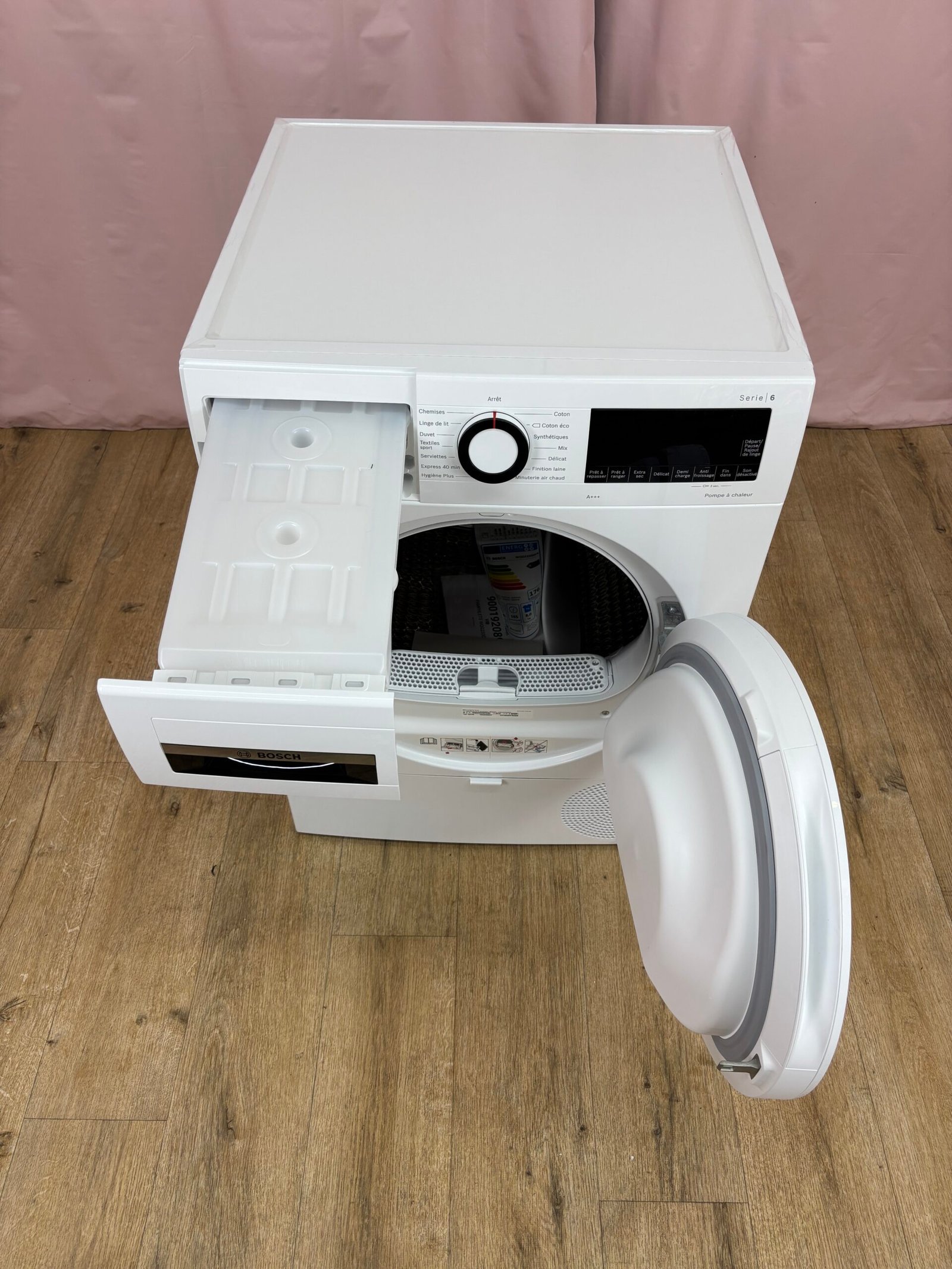 L’appareil propose une large sélection de programmes : coton, délicat, serviettes, chemises, duvet, mix, sport, hygiène et minuterie air chaud. La commande rotative et l’affichage LED assurent une utilisation simple. Fonction fin différée, ajout de linge en cours de cycle et rotation alternée pour éviter l’enroulement. Tuyau d’évacuation d’eau fourni.