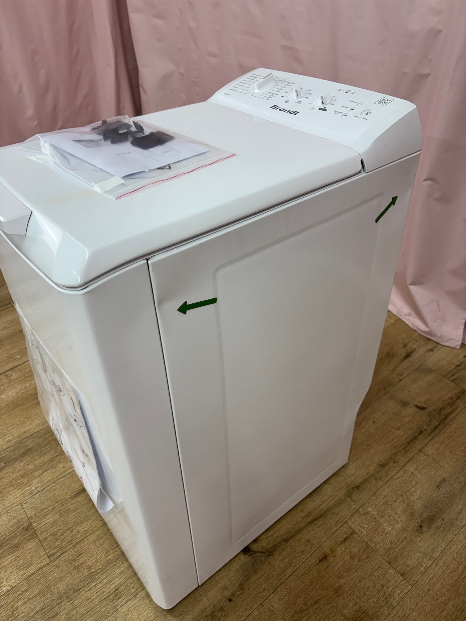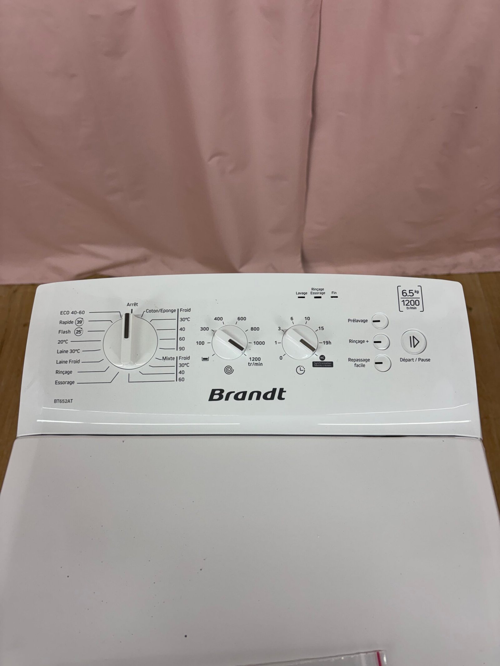 Le lave-linge Brandt BT652AT est un modèle à chargement par le dessus, pensé pour s’intégrer facilement dans les espaces réduits grâce à sa largeur de 40 cm. Il offre une capacité de 6,5 kg, adaptée aux besoins d’un foyer de taille moyenne.