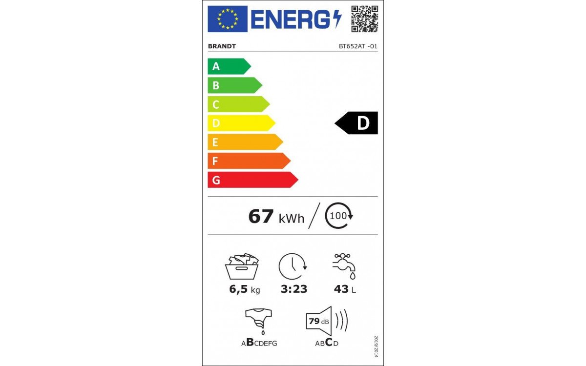 La vitesse d’essorage est réglable jusqu’à 1 200 tr/min, avec plusieurs paliers disponibles selon le programme sélectionné. L’appareil est classé D en efficacité énergétique selon la norme actuelle, avec une consommation moyenne de 67 kWh pour 100 cycles et 43 litres d’eau par cycle en programme éco.