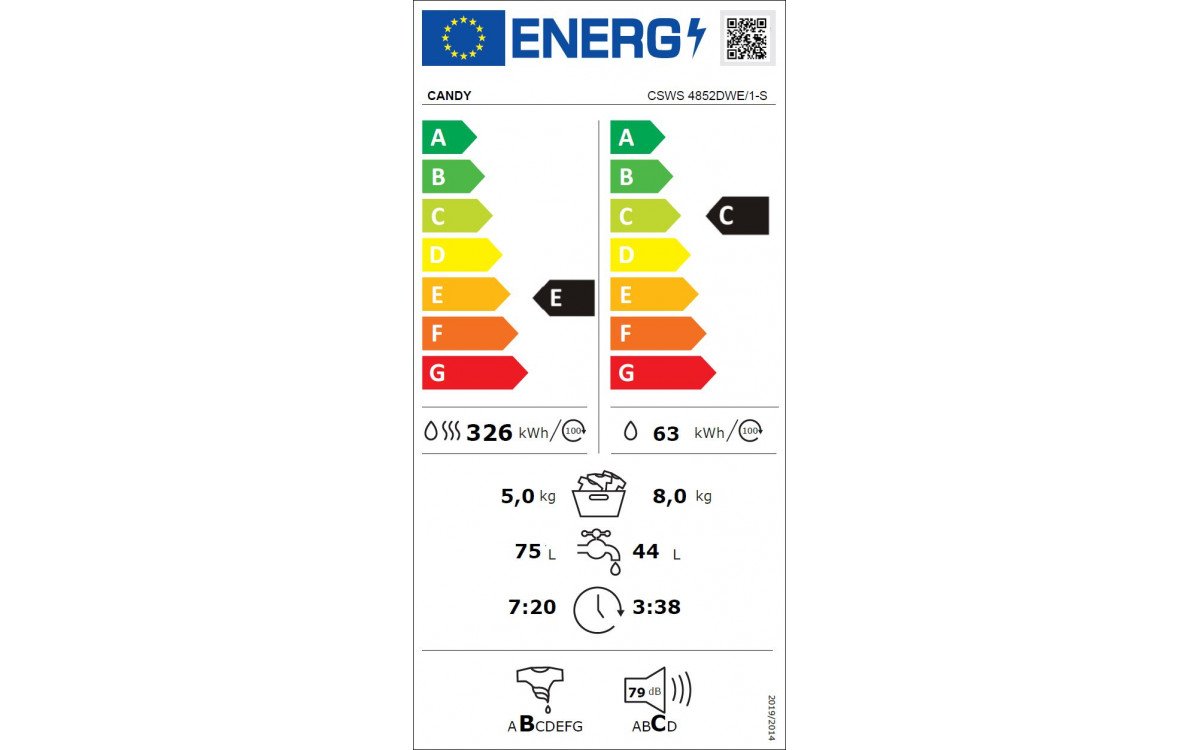 En lavage seul, l’appareil est classé C avec une consommation d’environ 63 kWh pour 100 cycles et 44 litres d’eau par cycle. En cycle lavage et séchage, la consommation est d’environ 326 kWh pour 100 cycles et 75 litres d’eau par cycle. Le niveau sonore en essorage atteint 79 dB.