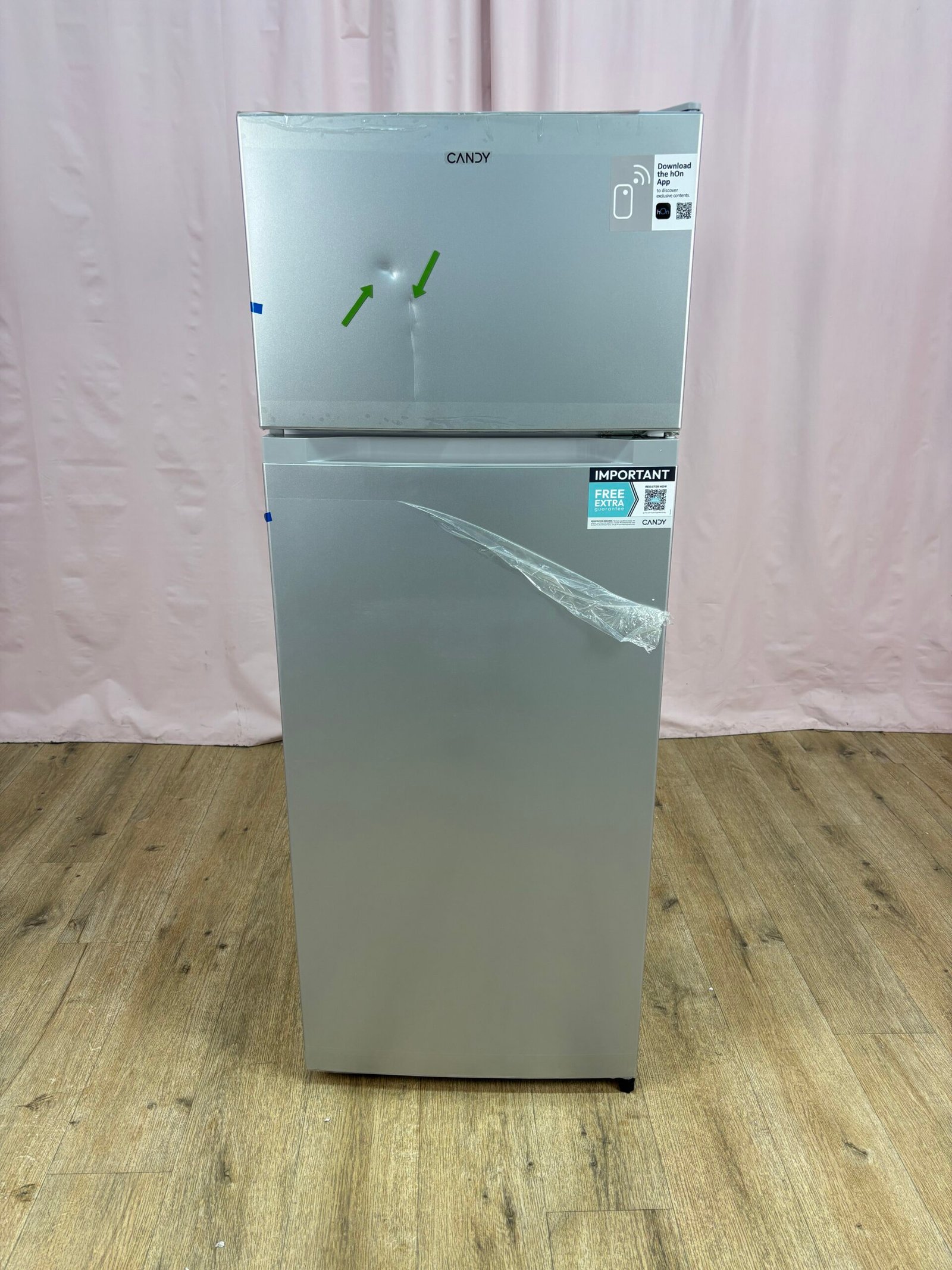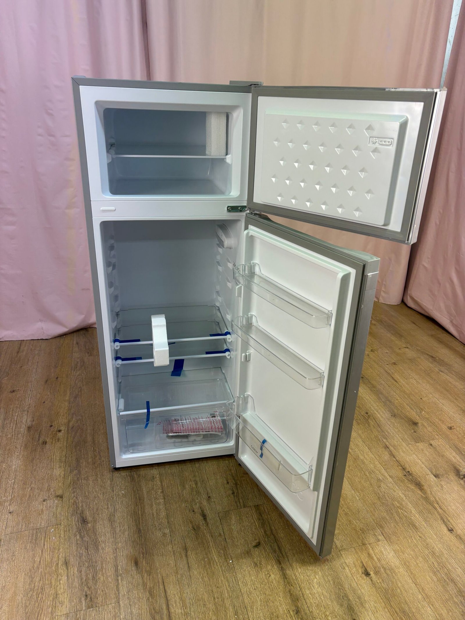 Réfrigérateur CANDY CDG1S514DS 211 L, jamais utilisé avec défaut d’aspect. Froid statique, congélateur en haut et design inox, idéal pour un usage quotidien simple et efficace.