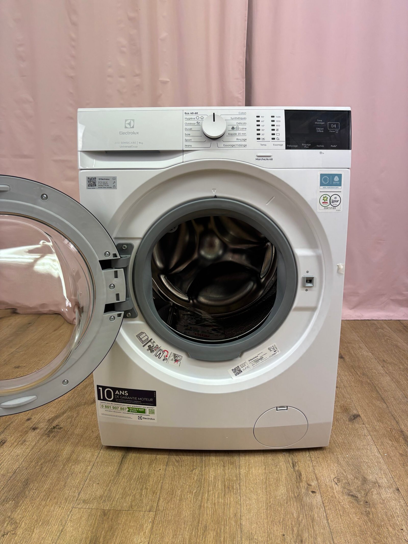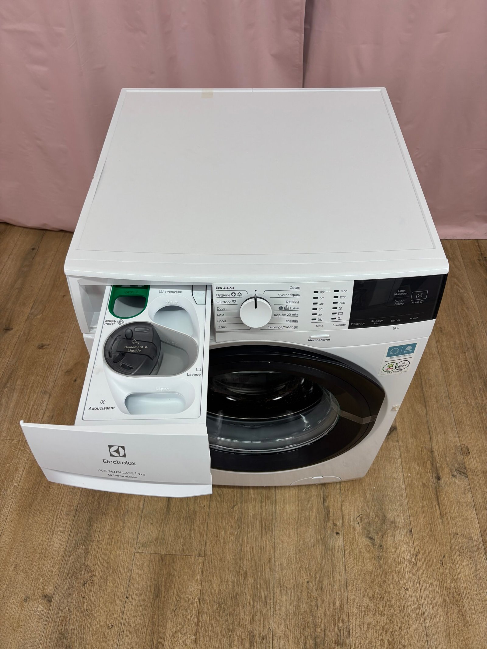 Le lave-linge ELECTROLUX EW6FI22914OV, appartenant à la gamme SensiCare 600, propose une capacité de 9 kg avec un tambour de ≈ 68 L, convenant parfaitement à un foyer de 3 personnes . Il offre une vitesse d’essorage maximale de 1 400 tr/min et un niveau sonore d’environ 76 dB en essorage.