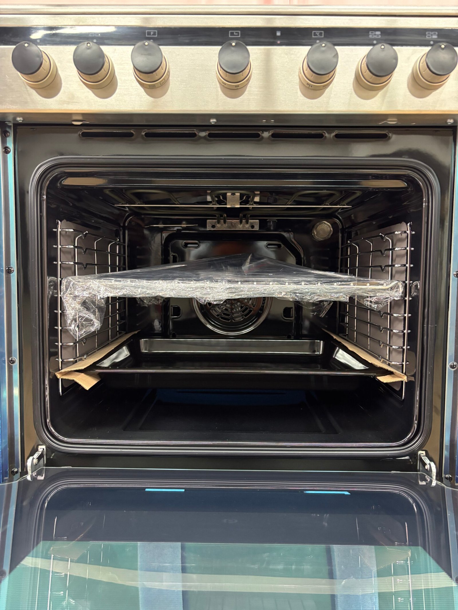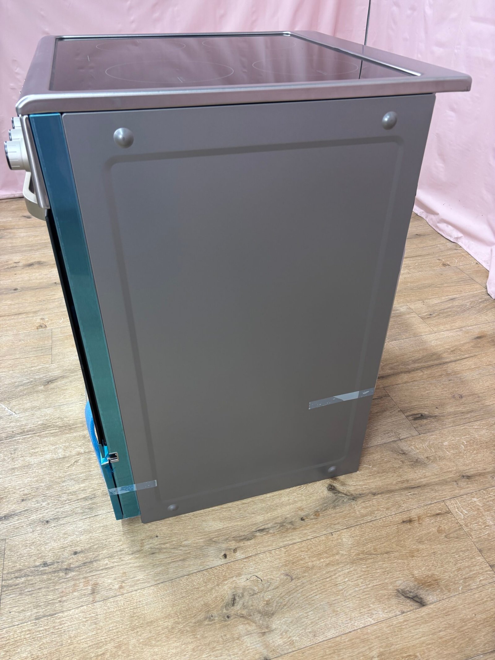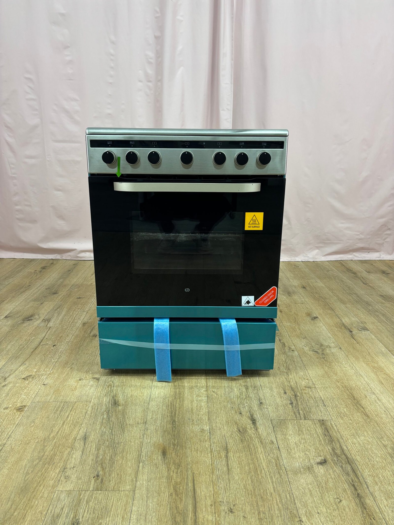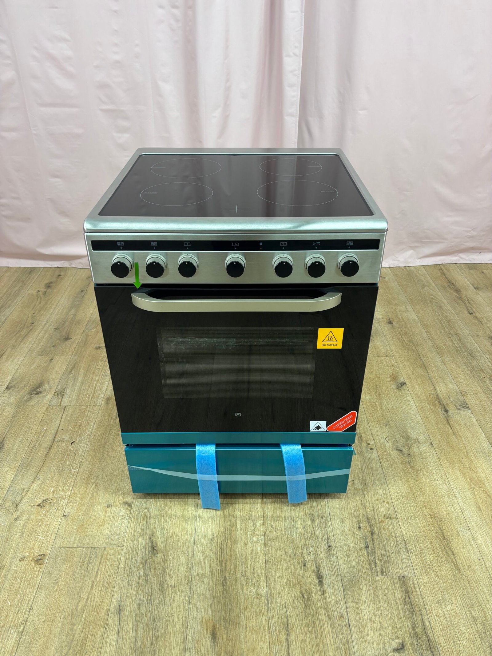 État : Jamais utilisé, présentant des dommages dus au transport, avec une égratignure sur la poignée du four et un enfoncement sur la face gauche.