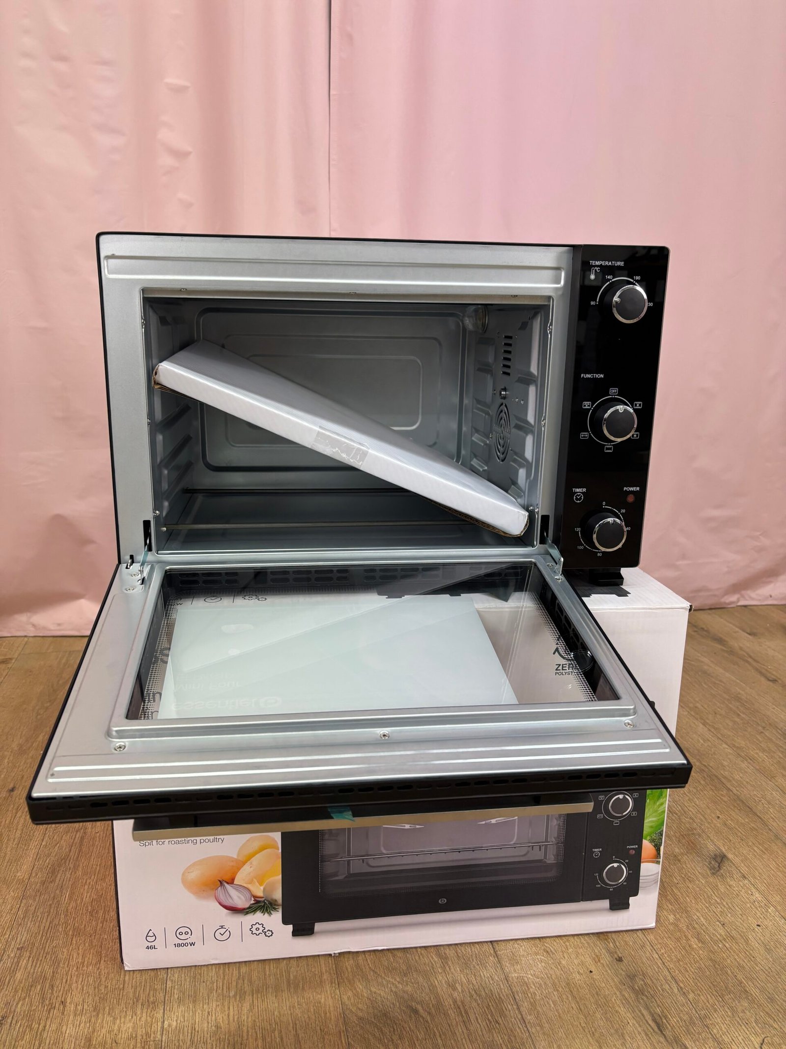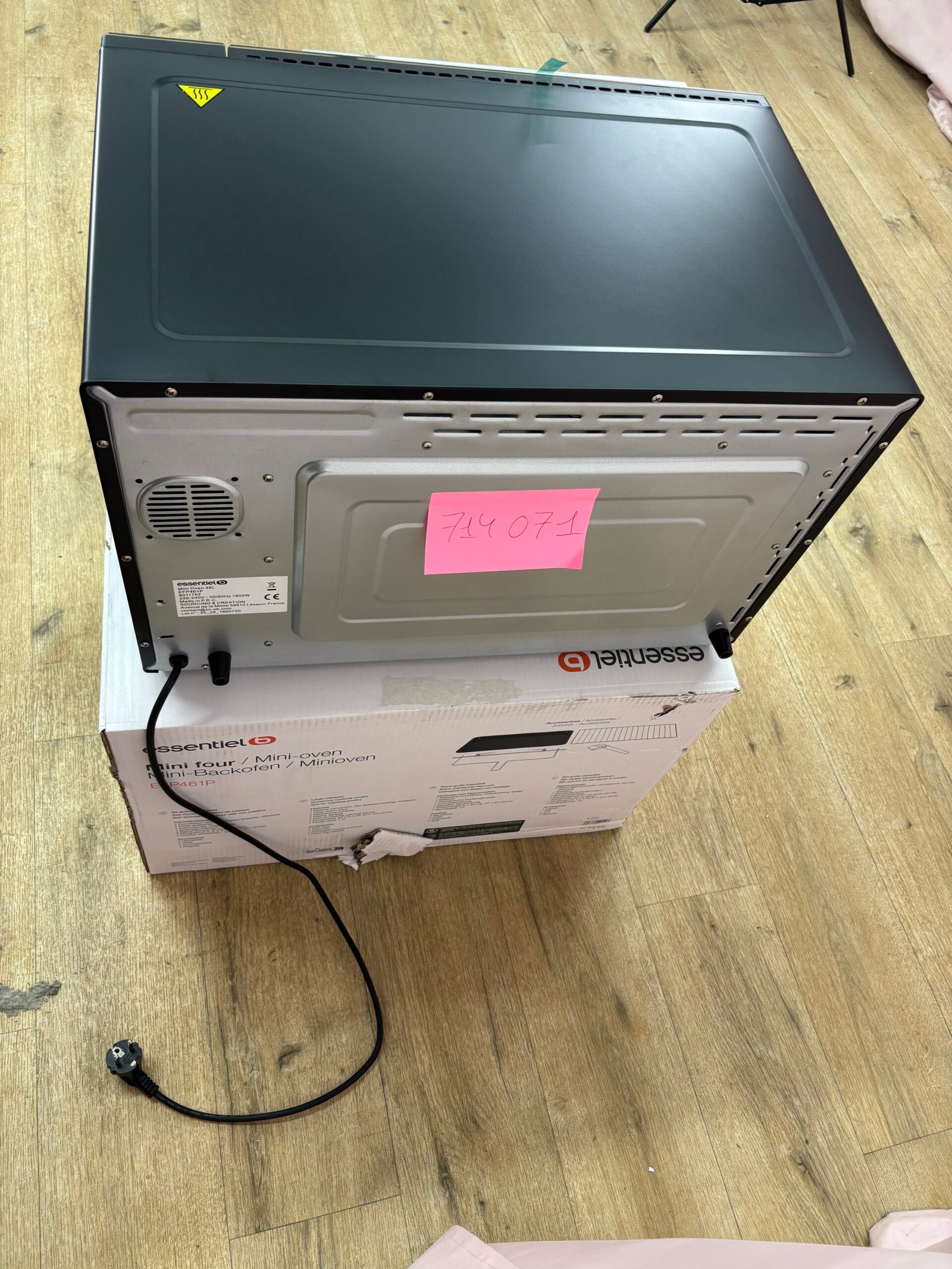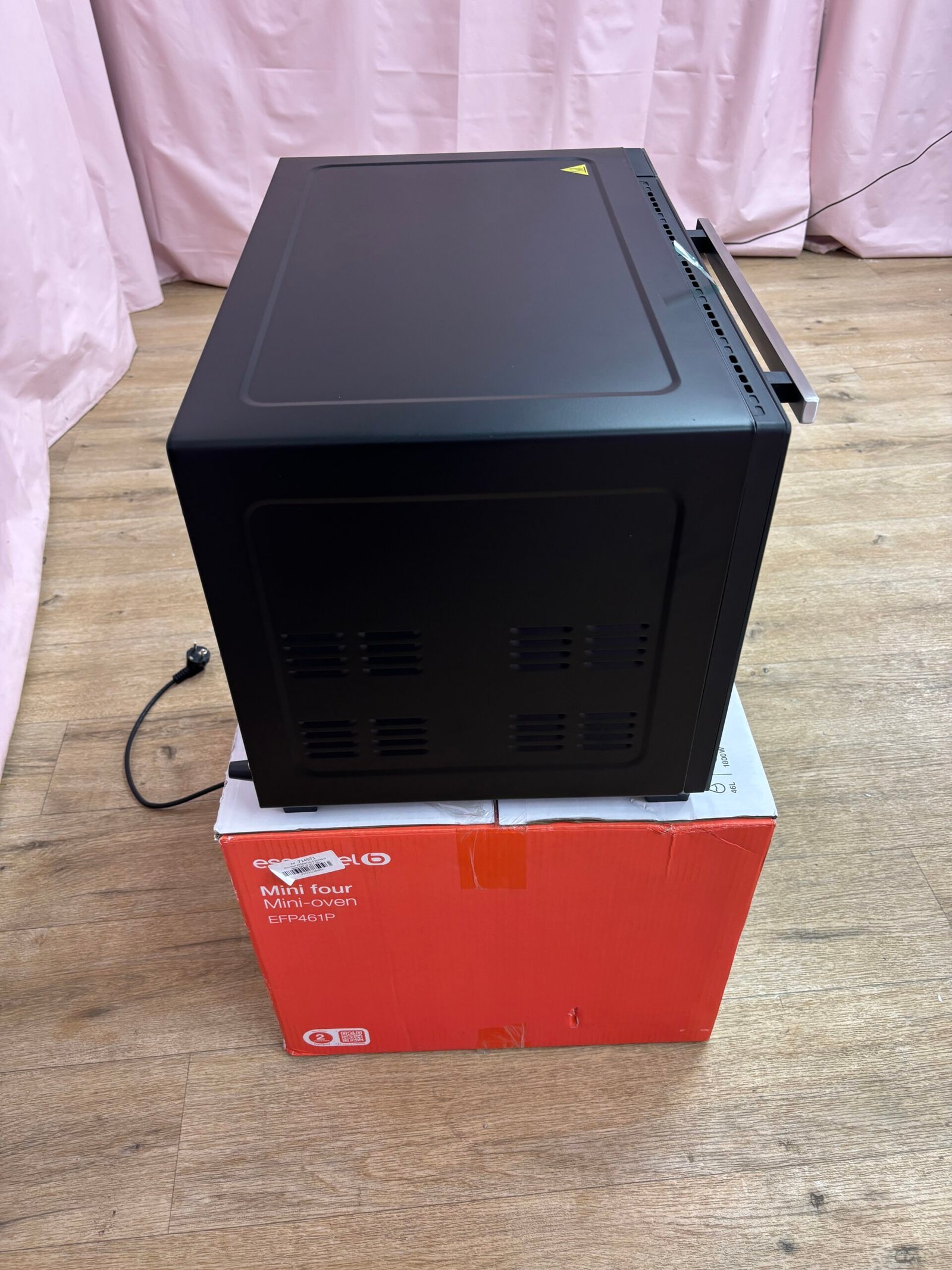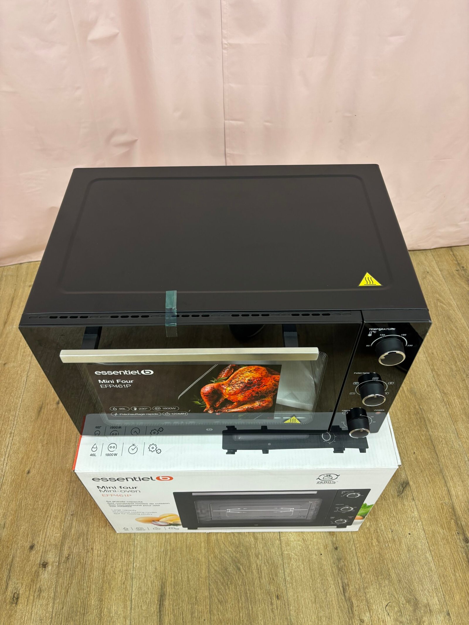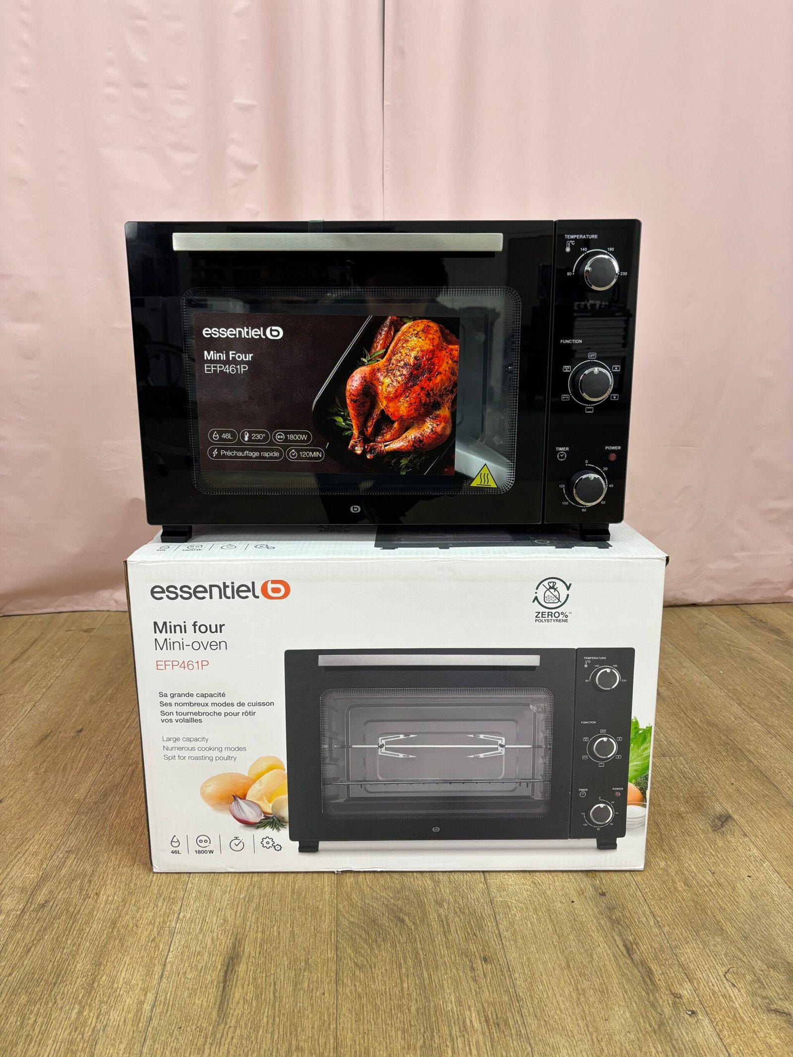 Mini four EssentielB EFP461P jamais utilisé – sans défaut. Capacité 46 L avec convection naturelle, thermostat réglable jusqu’à 250 °C et fonction tournebroche.