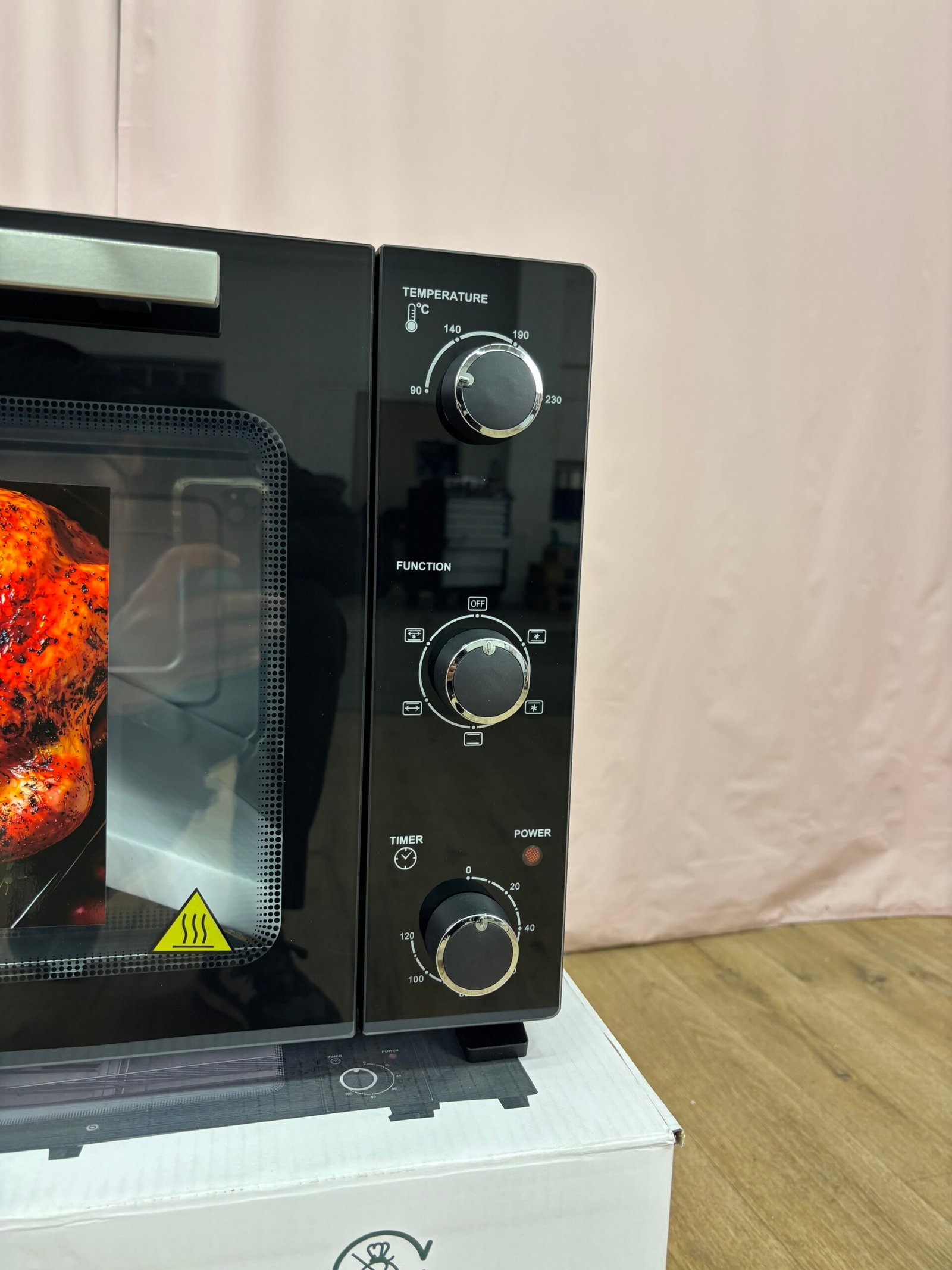 Le four dispose d’un thermostat réglable de 0 à 250 °C permettant d’adapter la température selon les recettes. Une minuterie d’une durée maximale d’une heure permet de programmer la durée de cuisson. L’appareil intègre également une fonction tournebroche permettant de rôtir uniformément certaines pièces de viande.