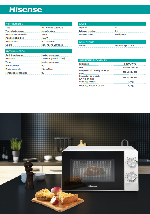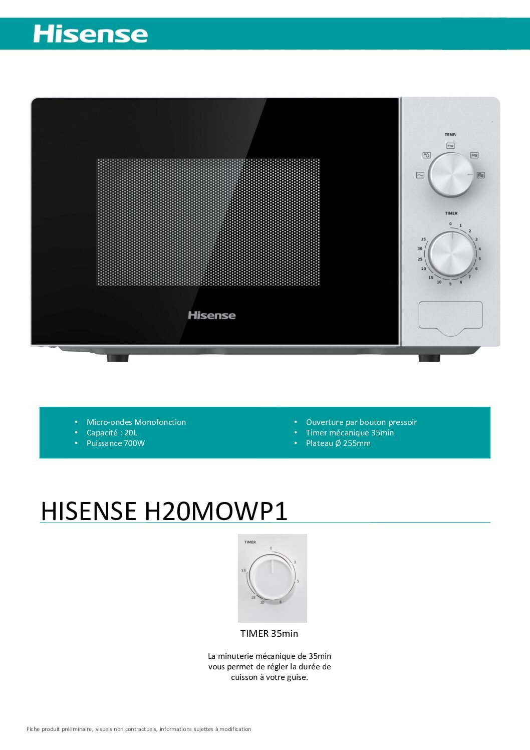 Le micro-ondes Hisense H20MOWP1 est un appareil compact, robuste et fonctionnel, parfait pour réchauffer, cuire ou décongeler en toute simplicité.