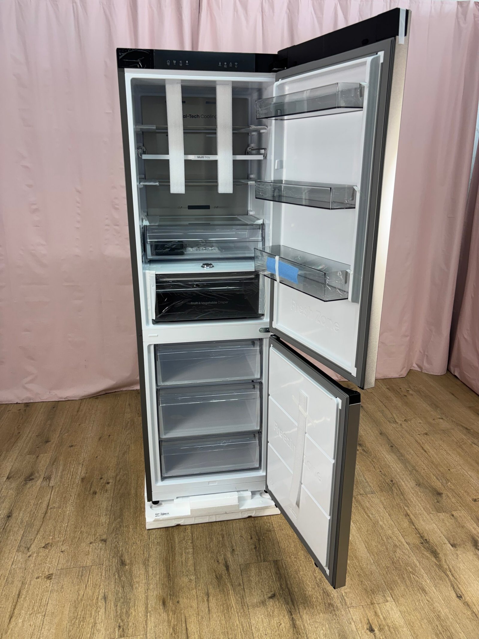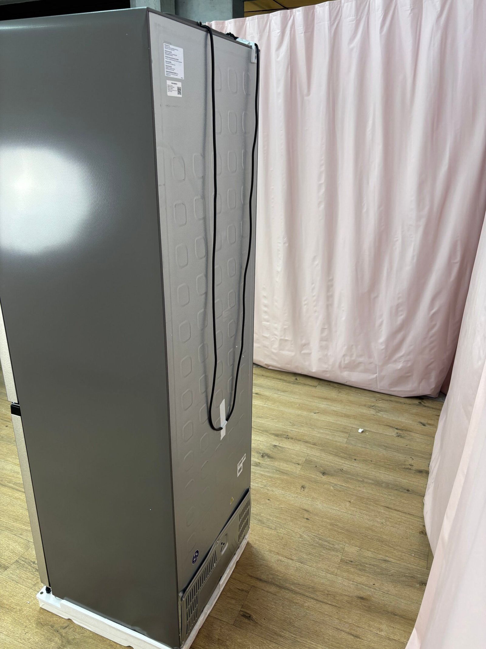 Réfrigérateur combiné en pose libre avec congélateur en bas, offrant une capacité totale de 330 L. Conçu pour s’intégrer facilement dans la cuisine grâce à son installation “FreshFit”, il peut être placé entre deux meubles avec un minimum d’espace.