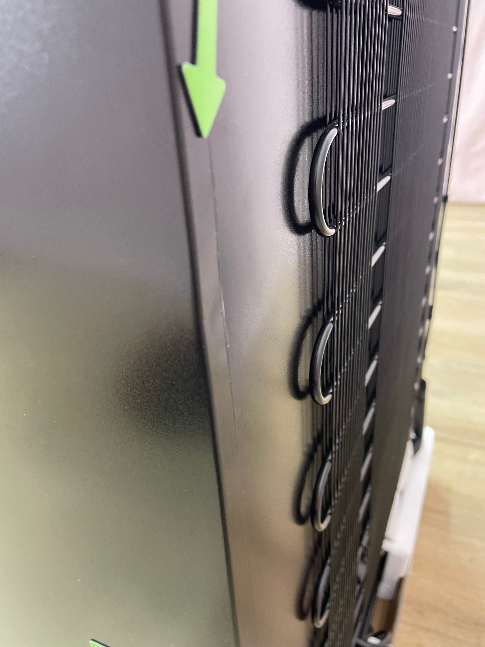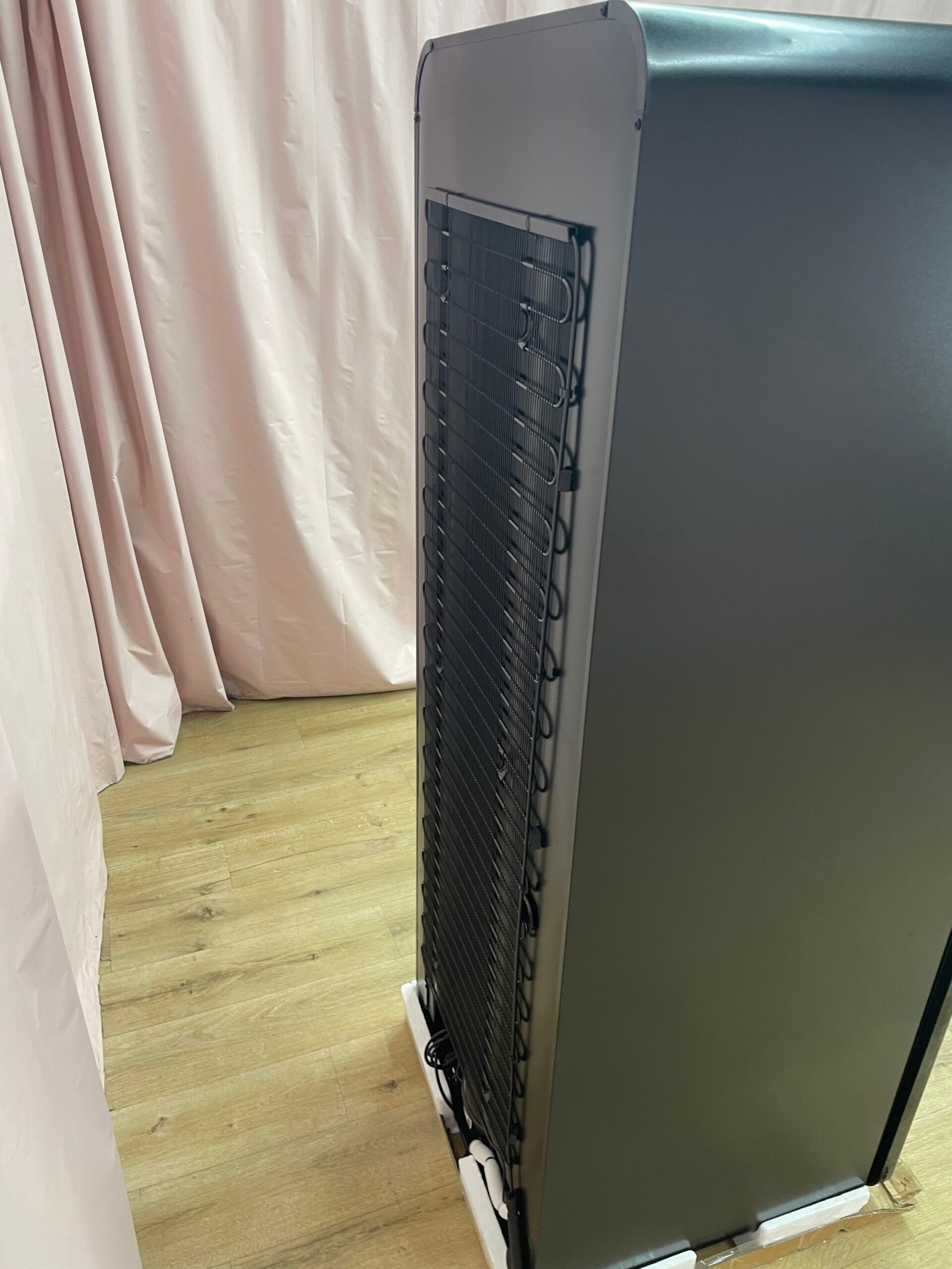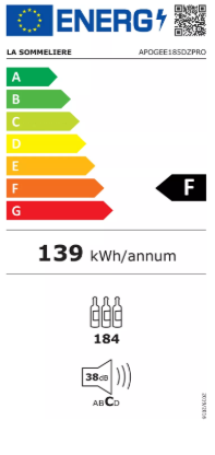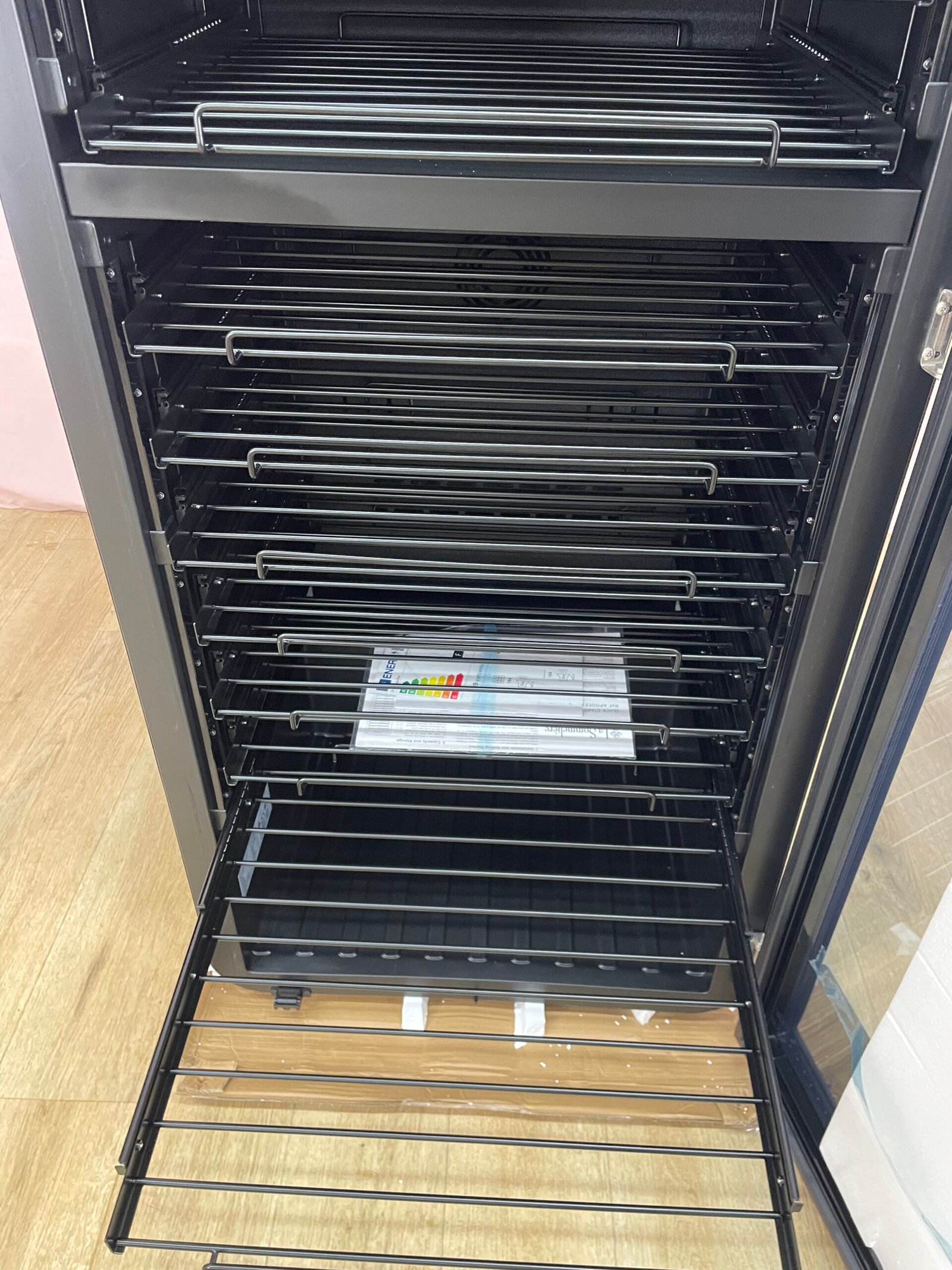 Les quatorze clayettes métalliques coulissantes facilitent l’accès aux bouteilles et offrent une grande capacité de rangement. L’éclairage LED latéral assure une bonne visibilité. La poignée intégrée donne une finition épurée, tandis que la serrure apporte une sécurité supplémentaire. Le niveau sonore de 38 dB permet une installation dans une pièce de vie.