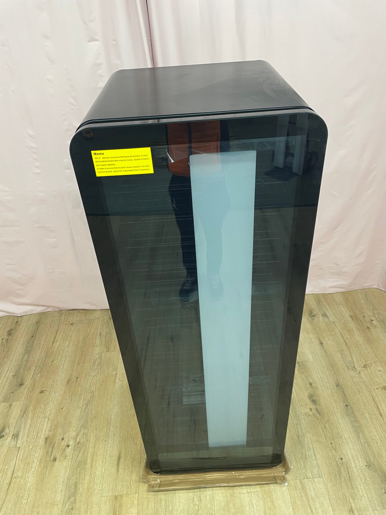 La cave dispose d’un châssis en verre et métal, d’un filtre à charbon et d’une classe climatique SN-ST permettant une installation dans un espace chauffé ou tempéré. L’appareil fonctionne avec un compresseur et inclut une serrure pour sécuriser la collection.