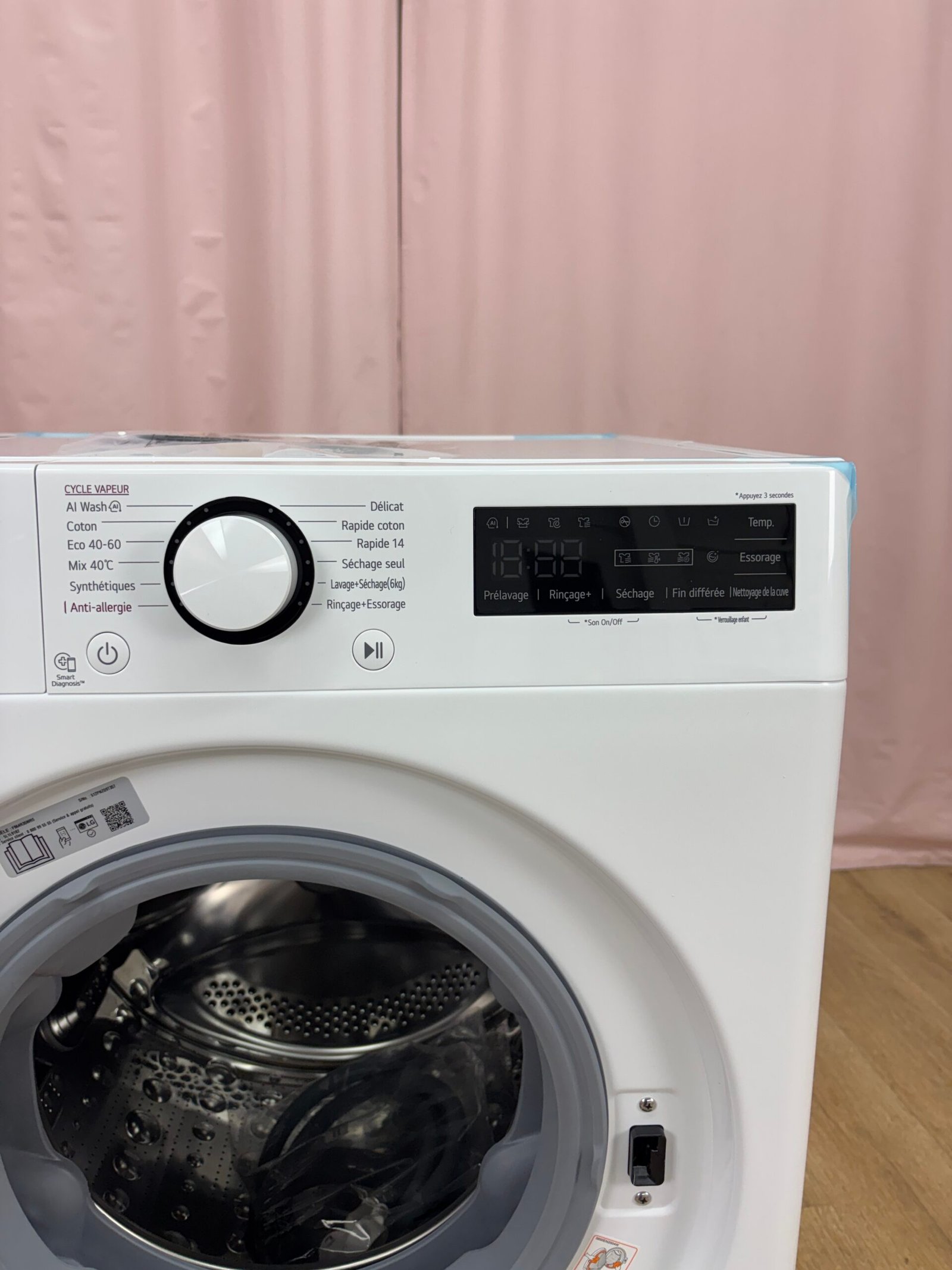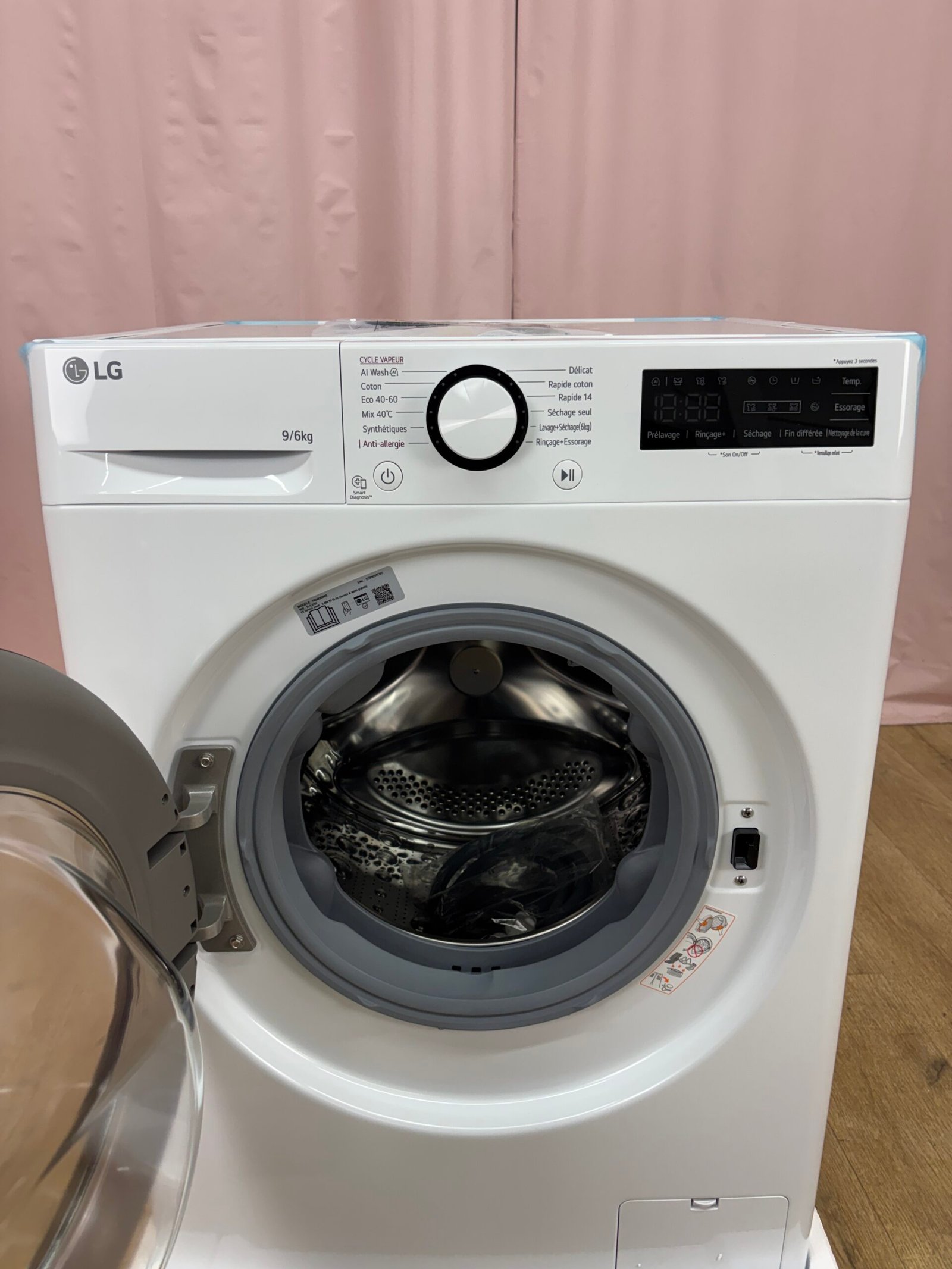 L’appareil dispose d’un écran digital et d’une fonction de départ différé programmable. Une connexion NFC permet d’utiliser la fonction Smart Diagnosis via l’application LG ThinQ afin d’identifier d’éventuels dysfonctionnements et d’obtenir un diagnostic rapide.