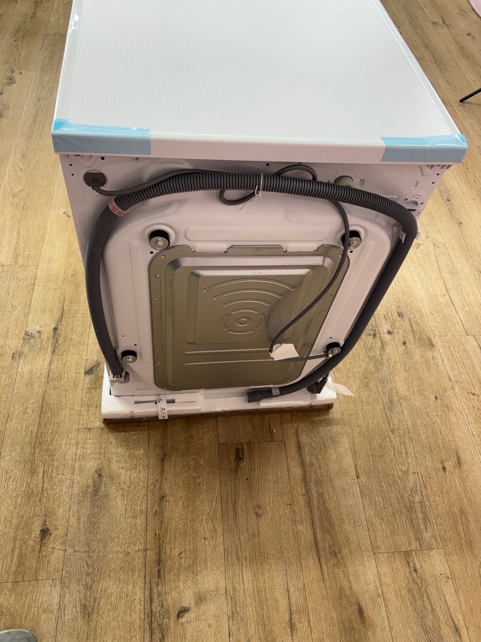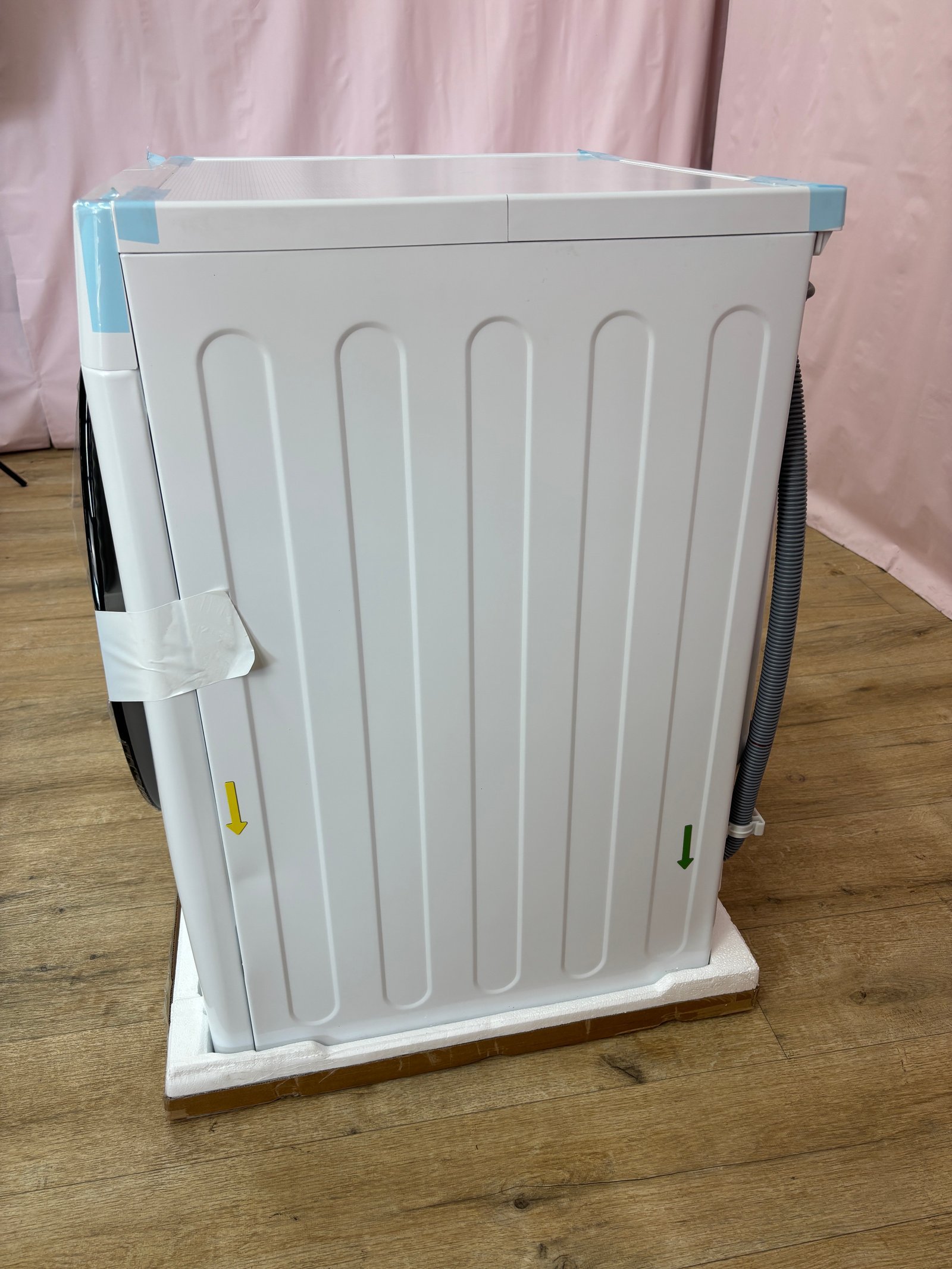 Dommages dûs au transport – Impacts multiples face gauche et droite. Lave‑linge séchant 9 kg/6 kg avec moteur Direct Drive, AI DD et fonction vapeur. Dimensions : 60 × 85 × 62 cm. Poids : 70.0 kg. Classe énergétique : D.