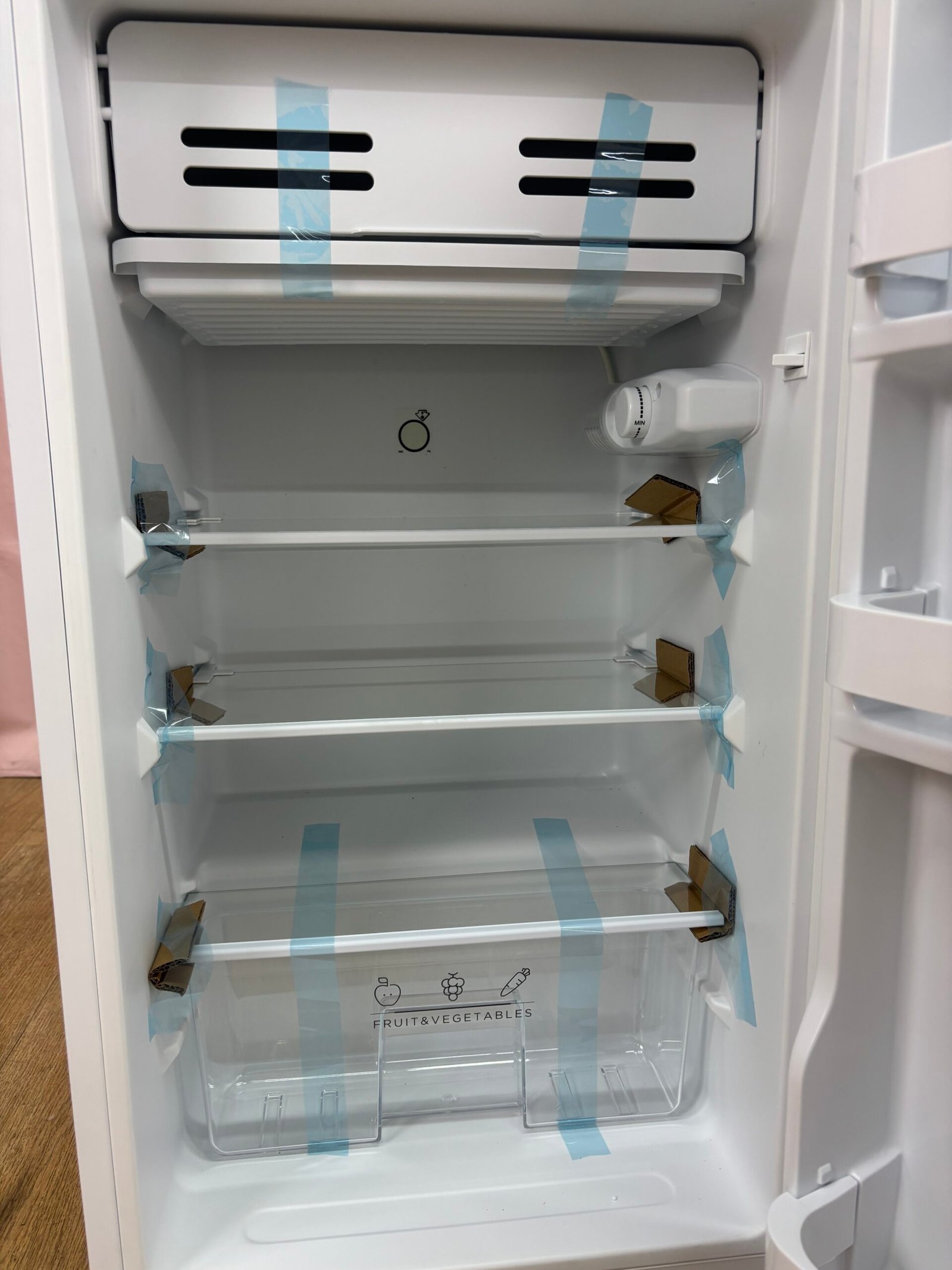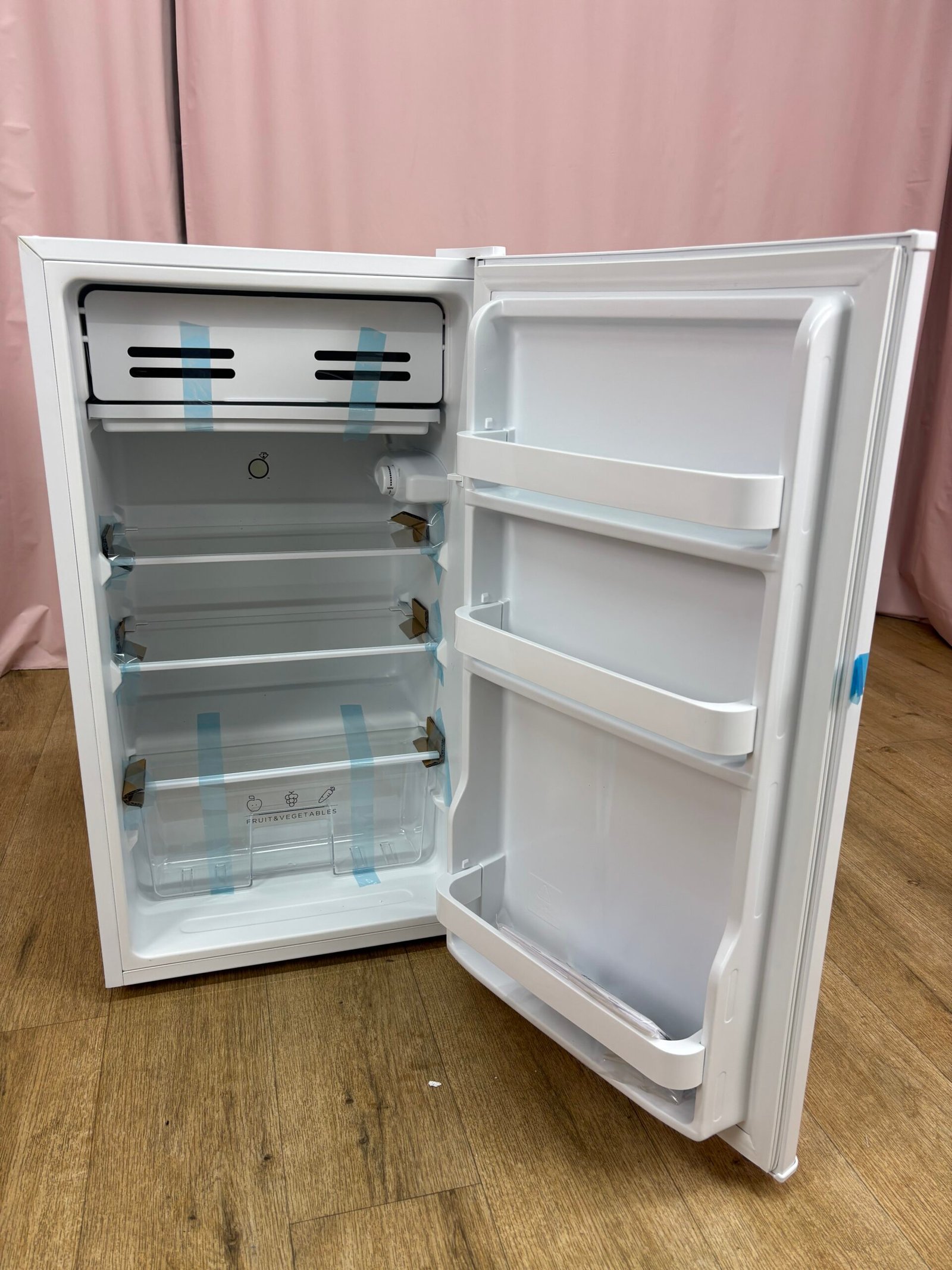 Le réfrigérateur offre un volume utile total de 93 litres. L’intérieur est équipé de trois clayettes en verre permettant d’organiser les aliments selon leur taille et leur fréquence d’utilisation. Trois balconnets sont présents dans la porte pour stocker bouteilles, condiments ou petits produits du quotidien.