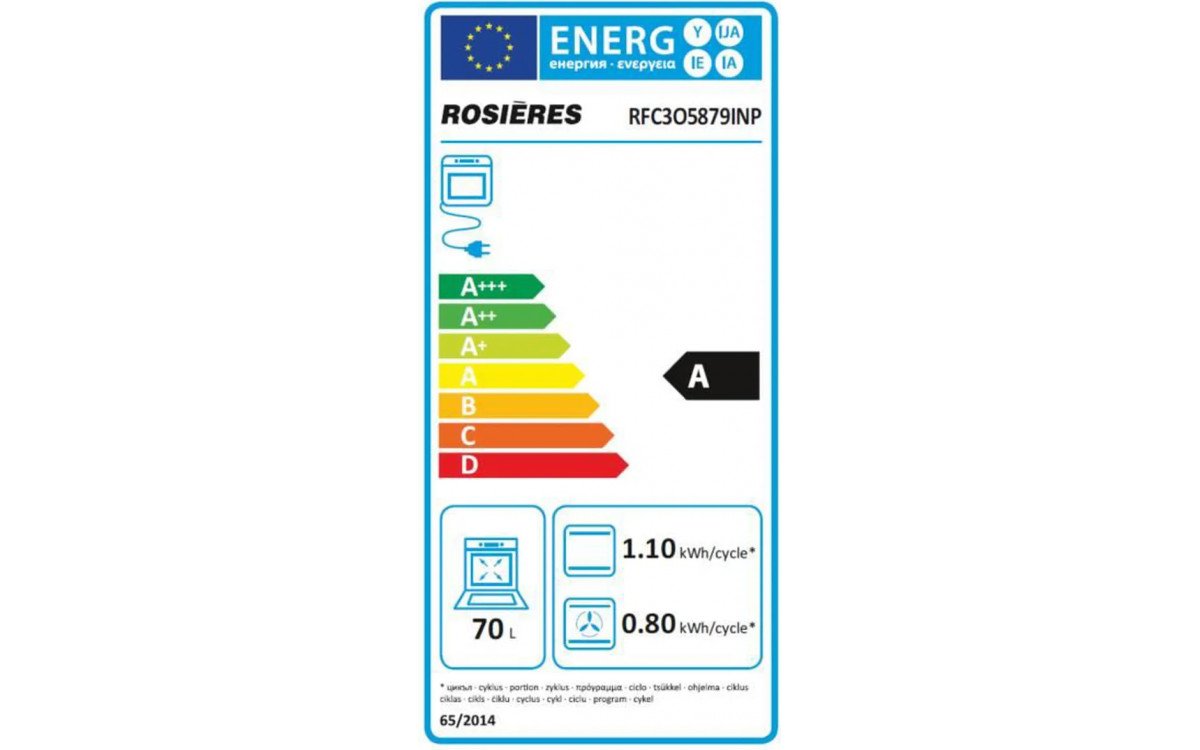 Le four encastrable Rosières RFC3O5879INP appartient à la gamme Nouvelle Origine. Conçu pour une intégration standard en niche de cuisine, il combine un volume généreux de 70 litres et une finition sobre associant façade noire et bandeau inox.