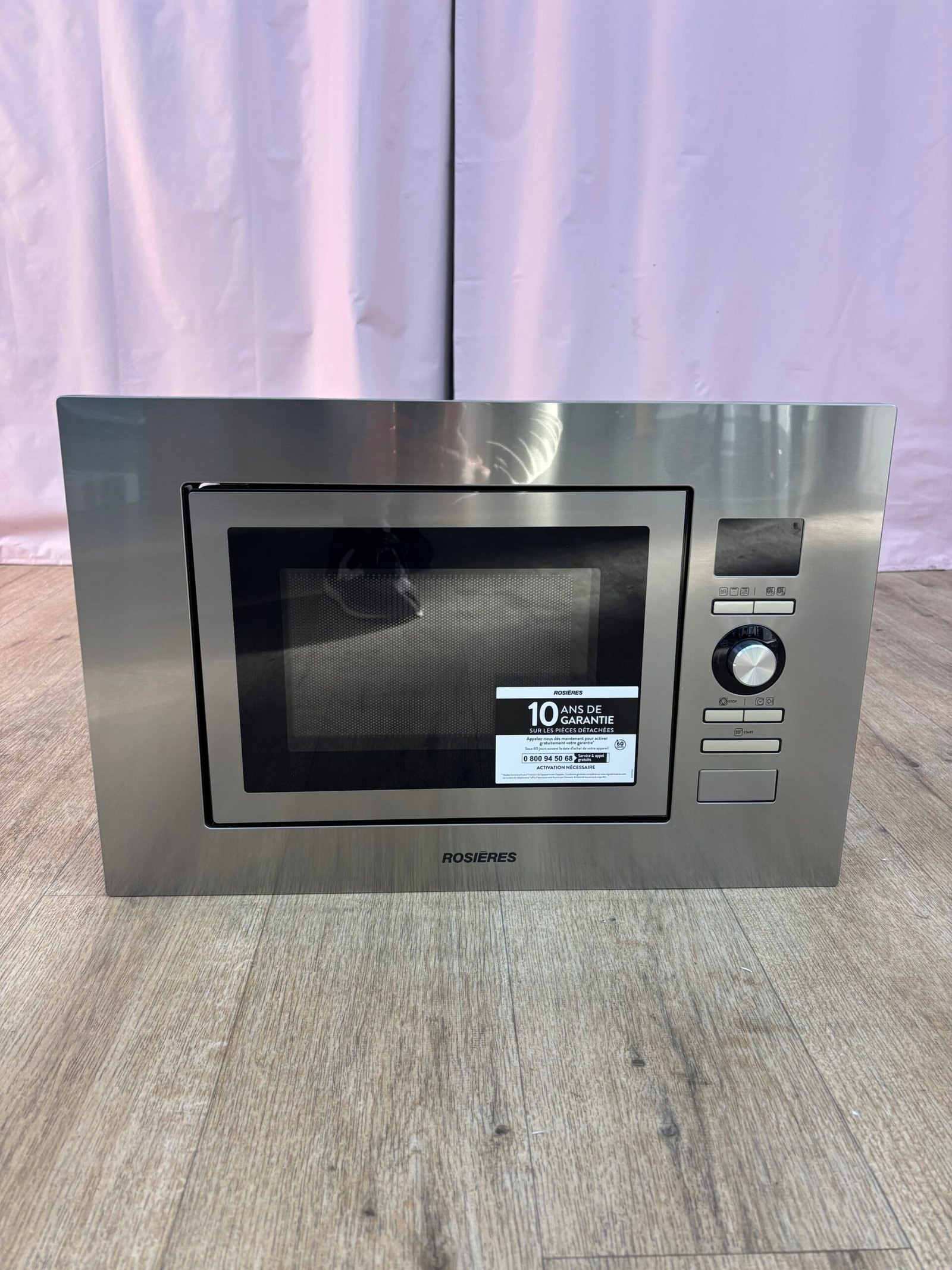 Le micro-ondes encastrable Rosières RMG201IN est conçu pour offrir une cuisson rapide, homogène et polyvalente dans une niche standard. Sa capacité de 20 litres et son plateau tournant de 24,5 cm permettent de chauffer ou cuire des plats variés, tout en s’intégrant discrètement grâce à son design sans cadre et sa façade en inox et verre noir.
