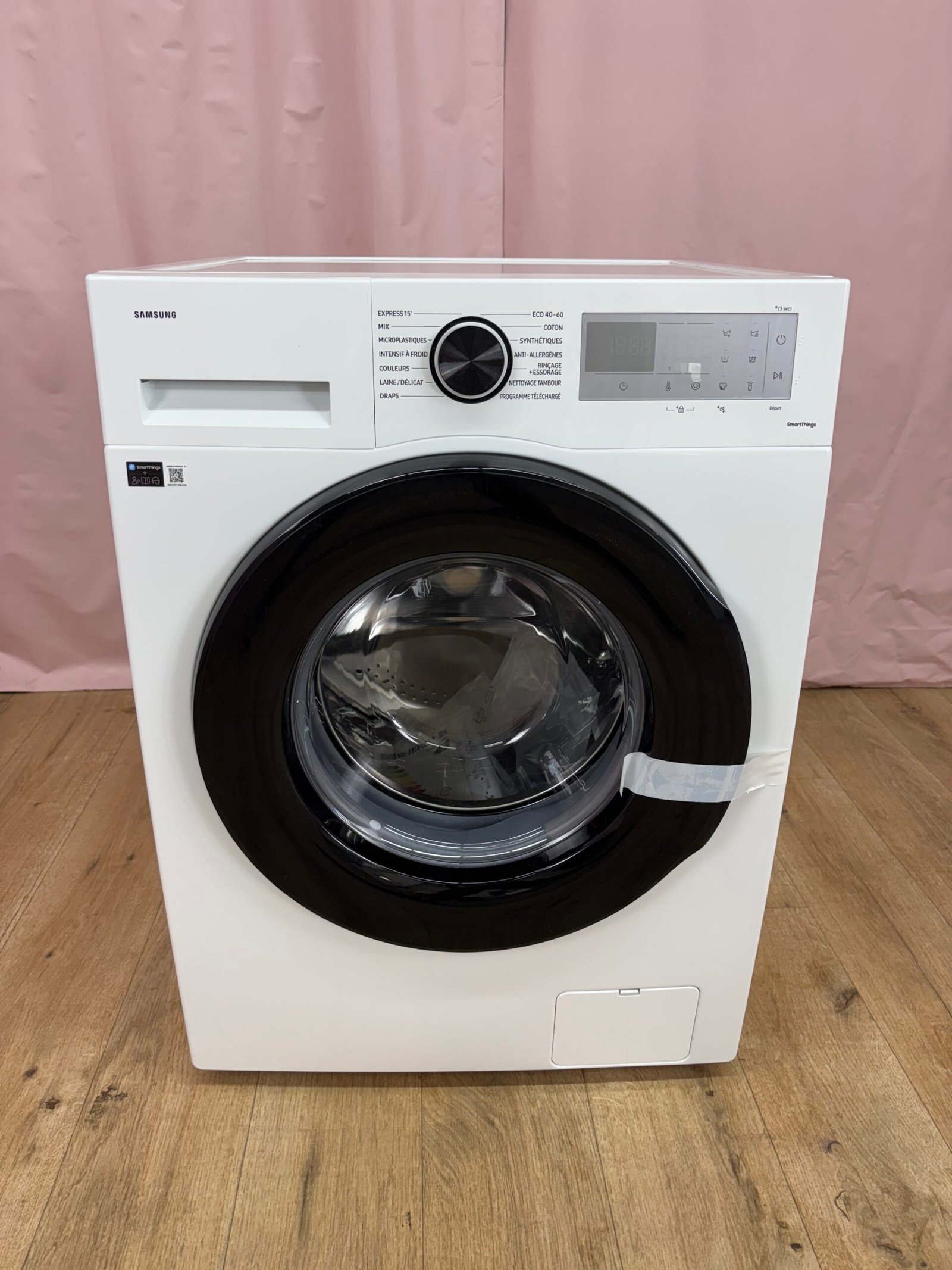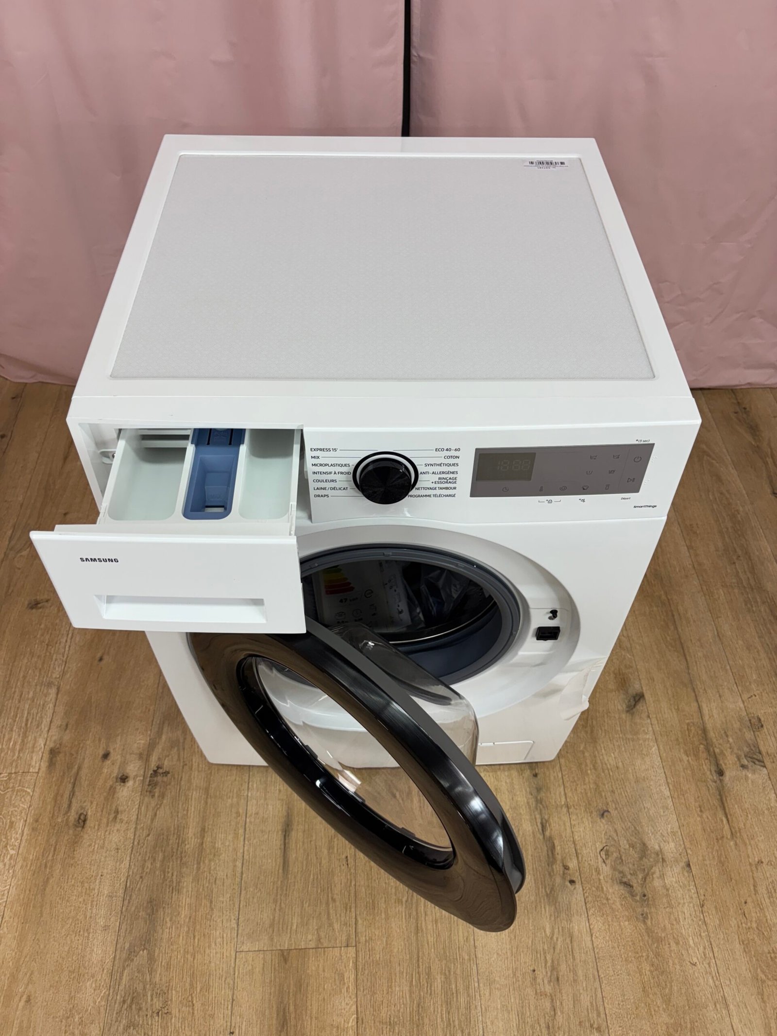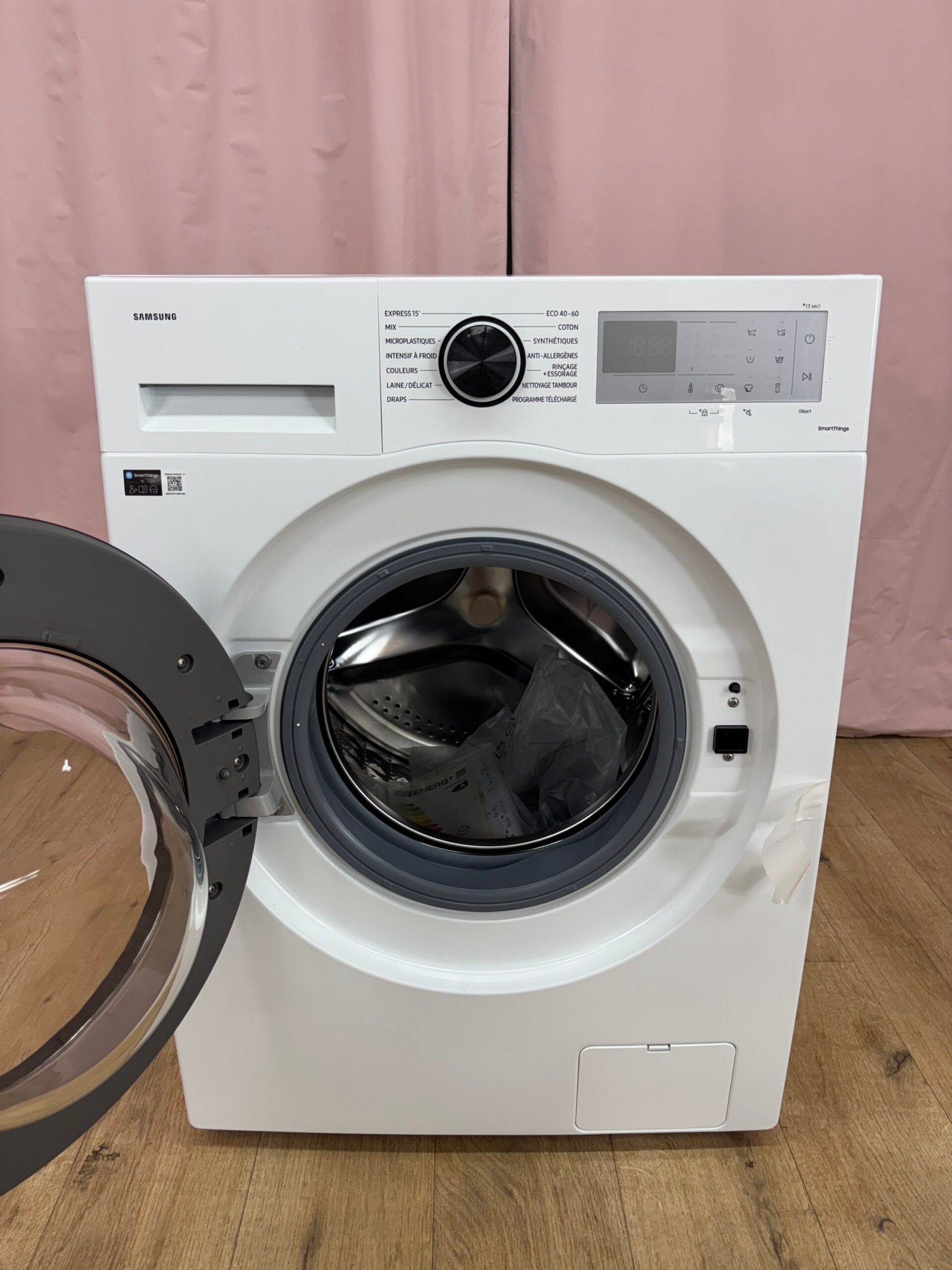 Le lave‑linge hublot Samsung WW80CGC04DAH offre une capacité de 8 kg avec un essorage jusqu’à 1 400 tr/min. Son moteur Digital Inverter réduit les vibrations et assure une longévité accrue tout en consommant moins. La technologie Ecobubble transforme la lessive en mousse ultra‑fine qui pénètre rapidement les fibres pour un lavage efficace à basse température. La fonction Program Hygiénique élimine 99,9 % des bactéries. Un écran LED indique le temps restant et permet de choisir parmi plusieurs programmes (rapide 15 min, coton, synthétique, délicat…). La classe énergétique A (nouvelle étiquette) garantit un niveau de consommation très bas. Le poids net est d’environ 68 kg.