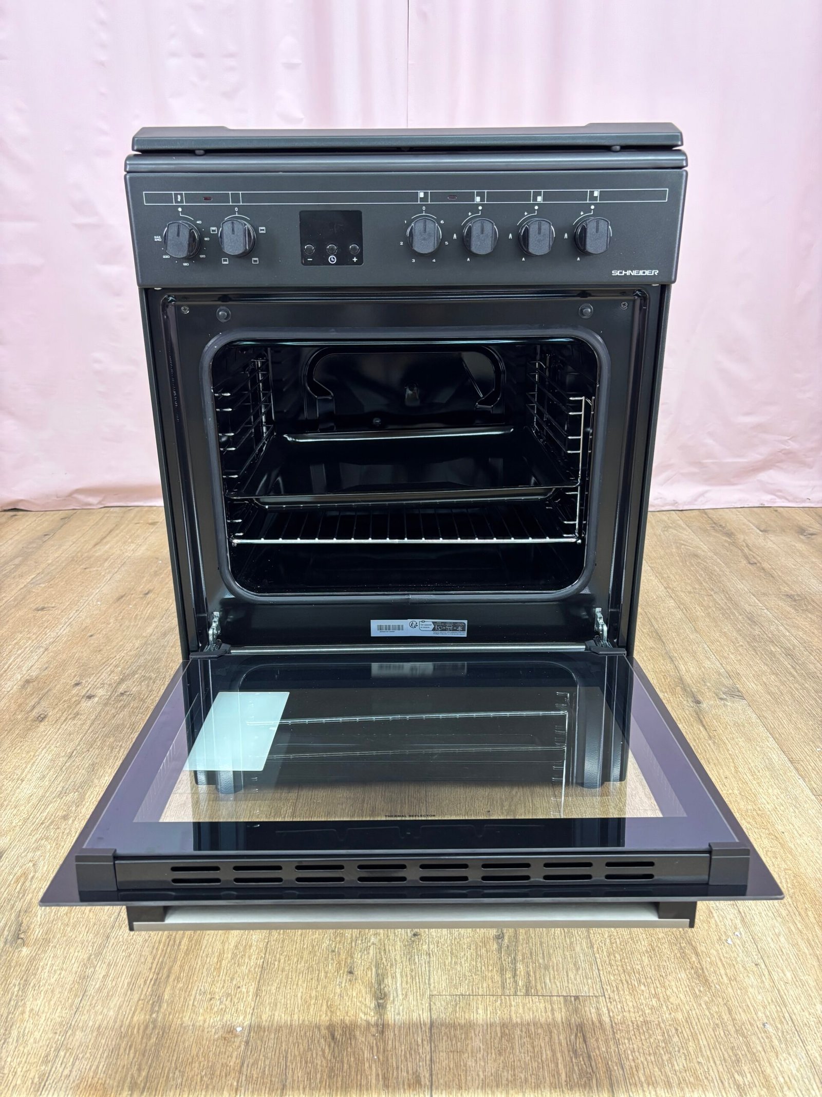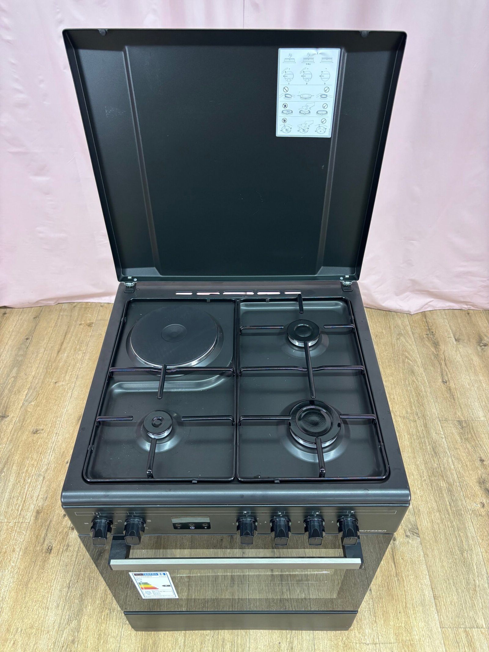 La cuisinière mixte Schneider SCG631CB combine une table gaz trois foyers, un foyer électrique et un four de 66 L en convection naturelle. Elle offre une grande flexibilité d’usage, permettant de cuire, mijoter ou saisir rapidement grâce au brûleur puissant de 2900 W.