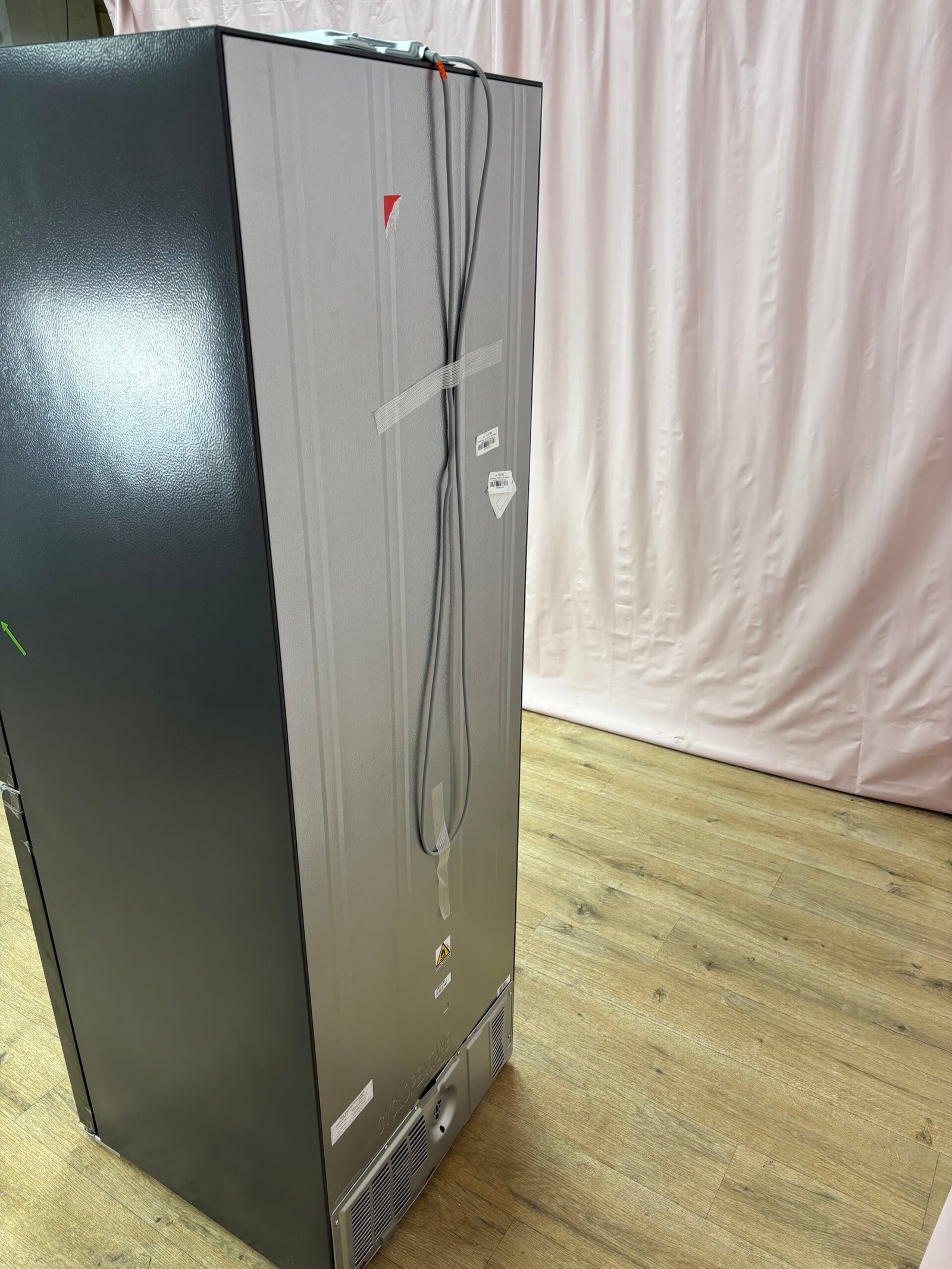 Les portes sont réversibles avec poignées intégrées afin d’adapter l’ouverture selon l’agencement de la cuisine. Des pieds réglables et des roulettes facilitent l’installation et la mise à niveau de l’appareil. Le congélateur possède une capacité de congélation d’environ 11 kg par 24 heures.