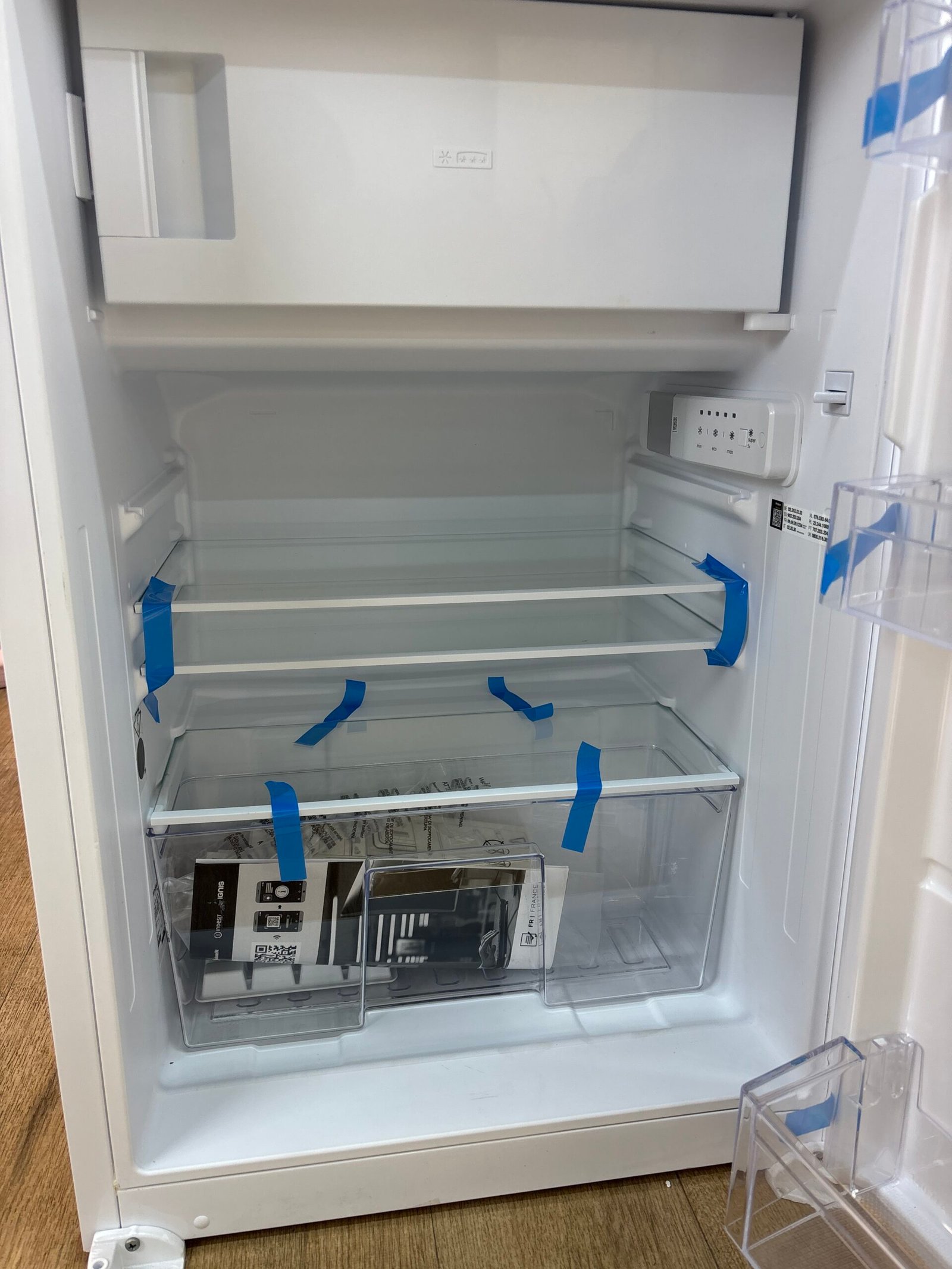 Les trois clayettes en verre dont deux ajustables permettent une organisation flexible du rangement. La porte réversible facilite l’installation selon la configuration de la cuisine. L’intérieur est pensé pour une utilisation simple et immédiate.