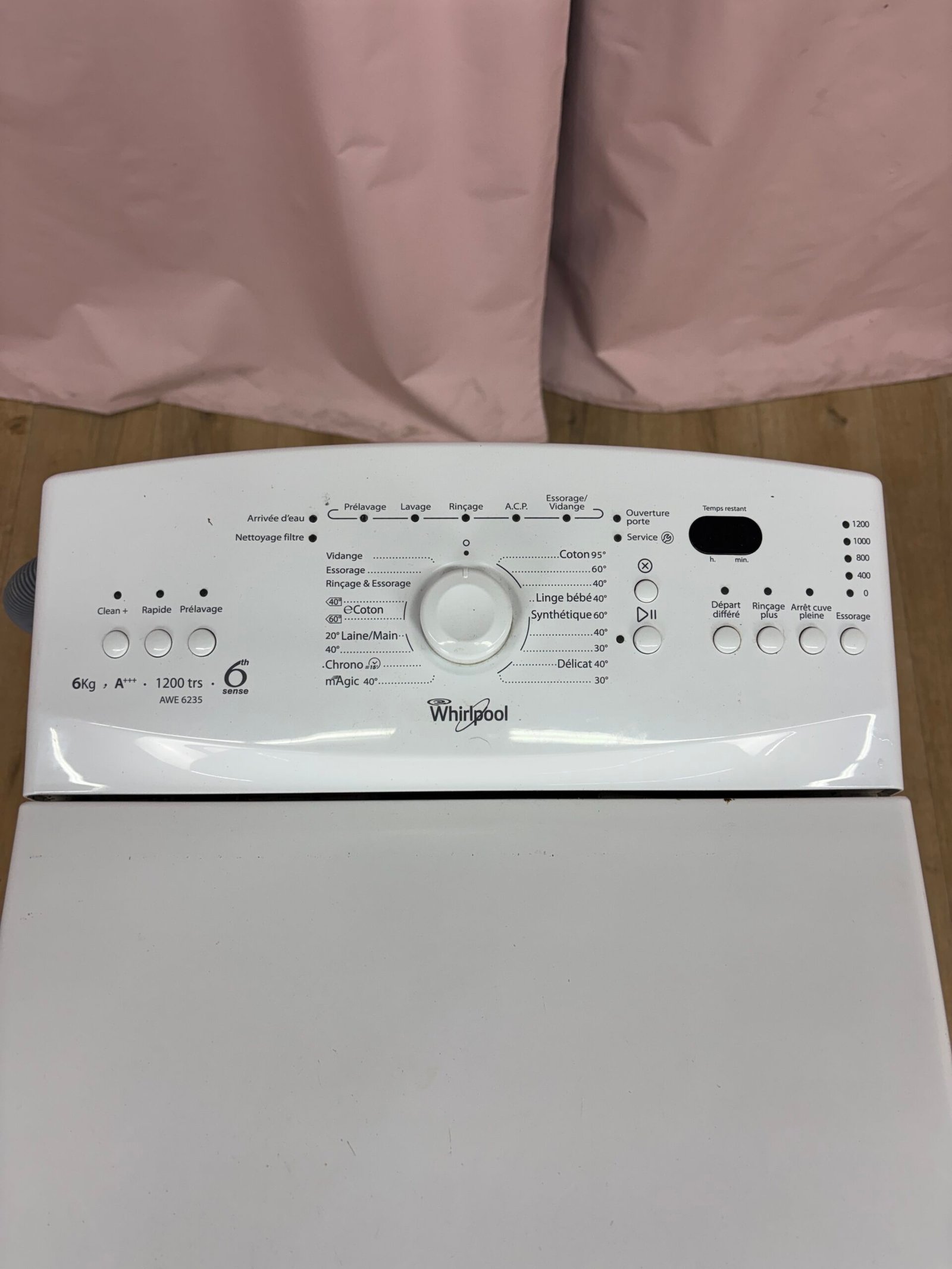 Le lave-linge Whirlpool AWE 6235 est un modèle à chargement par le dessus, conçu pour les espaces réduits tout en conservant une capacité confortable de 6 kg. Son format compact permet une installation facile en pose libre, notamment dans les cuisines ou buanderies étroites.