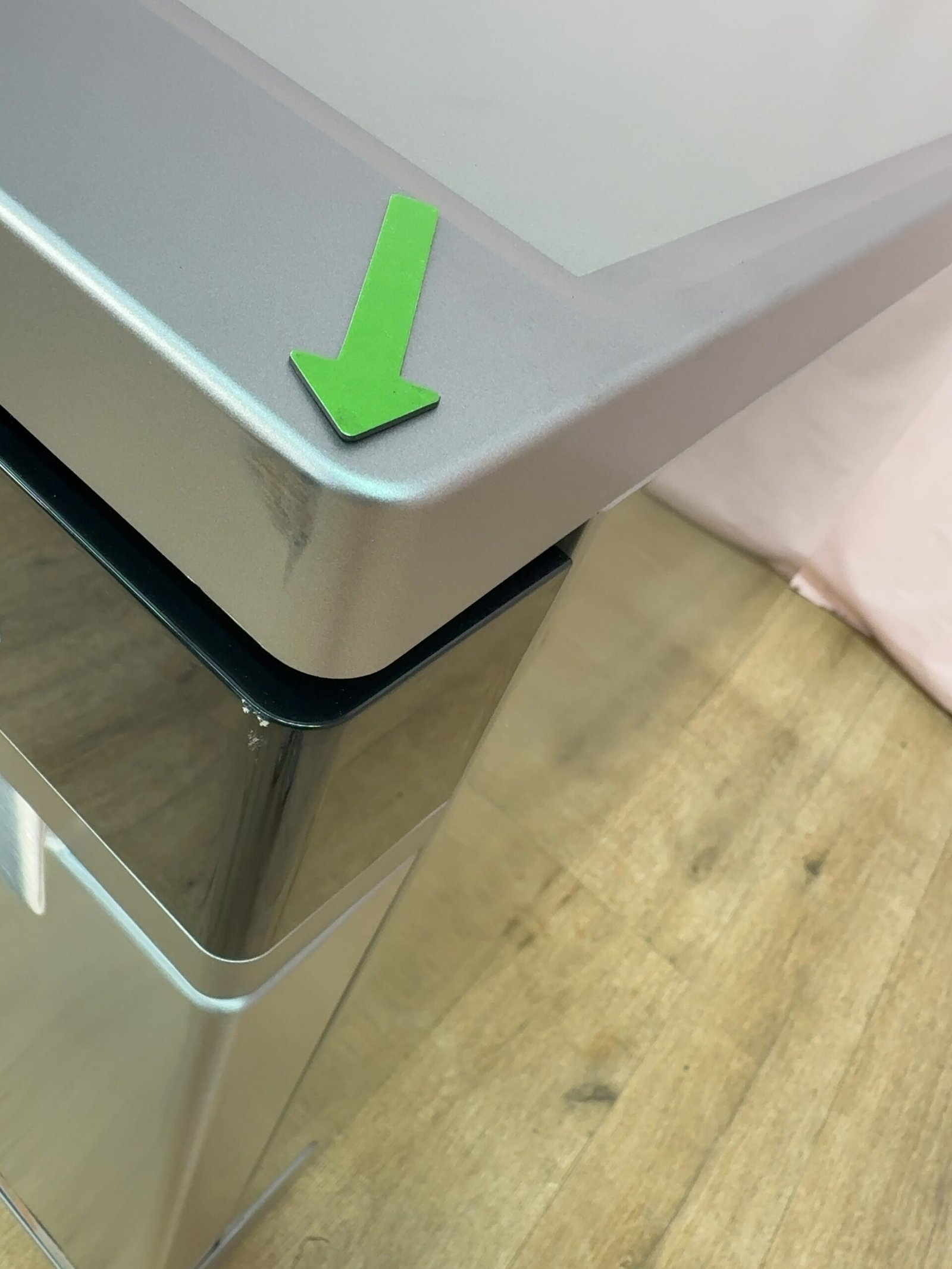 Etat : “Jamais utilisé – défaut d’aspect” – “Accroche du cache du bas cassée sur la gauche (ne bouge plus une fois installé), léger décalage porte, léger frottement sur le capot face avant”.